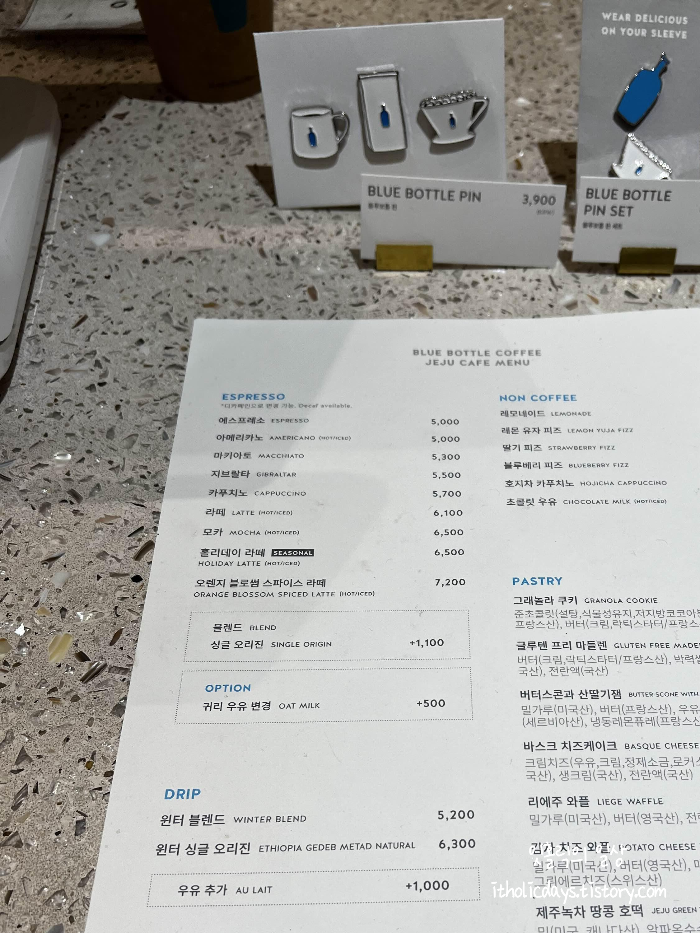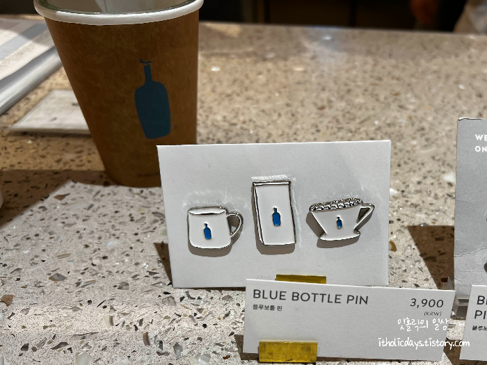 블루보틀 모양이 깨알같이 들어간 미니 뱃지들이 메뉴판 위에 놓여있어서 귀여워서 가까이 찍어봤습니다. 블루보틀 텀블러랑 드리퍼랑 블루보틀이랑 아기자기한 모양의 뱃지를 팔고 있었어요. 가격은 개당 3,900원이고 두 개 세트로 9,000원이니까 저렴하지는 않은데 블루보틀을 진짜 좋아하시는 분들은 구입하실 것 같아요. 그만큼 너무 귀엽거든요.