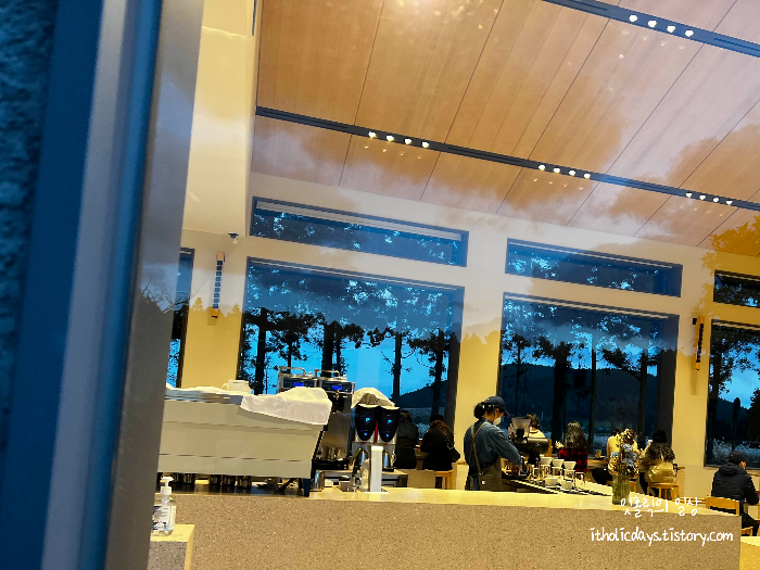 파란 하늘을 배경으로 파란물병컵을 찍어봤습니다. 입구 반대편에는 나무가 울창하게 있고 뭔가 사진을 찍을 수 있게 꾸며져 있어요. 밝을 때 오면 바깥 산책을 하면서 시간을 더 보낼 수 있을 것 같네요. 이곳은 신기하게도 날씨가 화창하거나, 비가 오거나, 바람이 세차게 불거나, 눈이 오거나 제주도의 어떤 날씨에도 예쁠 것 같은 곳이예요. 제주도 여행을 하면서 근처를 지나가신다면 꼭 방문해서 커피한잔 하고 가시길 추천합니다!