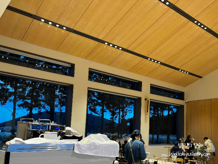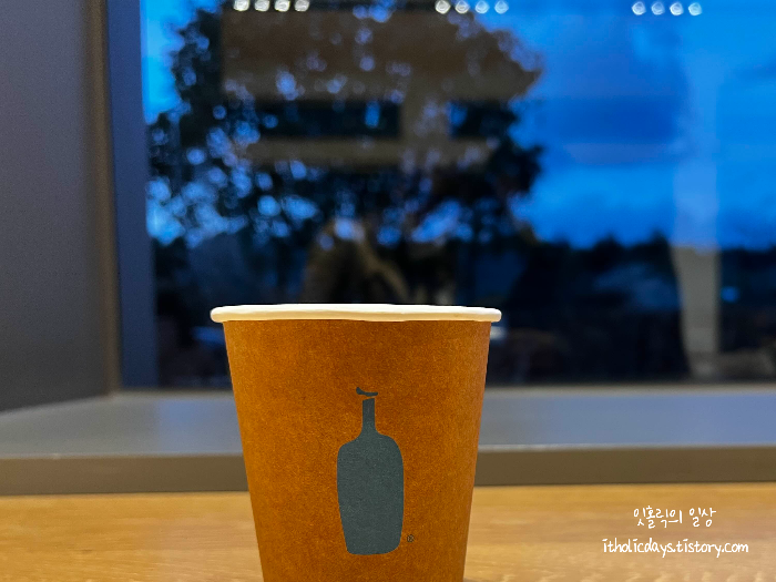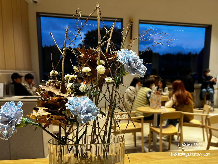 꽃병에 물이 있는걸 보니 조화는 아닌것 같은데 블루보틀의 컬러에 맞춰서 파란색 꽃을 장식해 놓은 것인가라는 생각이.. 그러고보니 해가 막 지고 난 뒤의 어둑한 하늘도 짙은 파란색인 느낌이 나서 색이 참 예뻤어요.