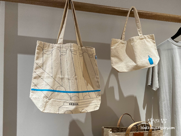 카운터 맞은 편으로 블루보틀 MD를 팔고 있었습니다. 저는 본적 없었던 가방이나 티셔츠들도 있었어요. 물론 그 옆으로 유명한 블루보틀 텀블러나 컵도 판매용으로 전시되어 있었습니다. 가까이서 보니 오클랜드 가방은 구매욕이 확 샘솟을만큼 만듦새가 좋았어요. 하지만 가격이 안습이어서 구경만 했습니다.