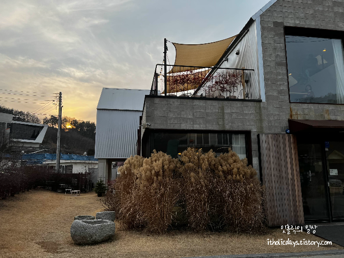 세종시에 놀라갔다가 차로 갈 수 있는 분위기 있는 카페를 찾다 카페 비일상에 가게 됐어요! 카페 측면에 열대 이상 주차할 수 있는 주차장이 있어서 차로 가기가 굉장히 편했습니다. 가는 길은 약간 한적해서 카페가 있을 거라는 생각이 들지 않지만요. 카페 너머로 해가 지는 모습이 예뻐서 카페의 전경과 같이 사진을 찍어봤습니다. 인테리어가 너무 잘 되어 있어서 겉에서 보기만 해도 만족스러워요.