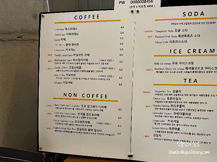 메뉴를 보면 아메리카노(5,000원), 라떼(5,500원), 플랫화이트(5,000원), 아포가토(6,000원) 같은 커피 메뉴와 감귤 소다(6,500원), 패션후르츠 소다(6,500원), 우유 아이스크림(5,000원), 감귤차(6,000원), 레몬라임차(6,000원) 등과 같은 카페인이 없는 음료 메뉴가 골고루 있어요.