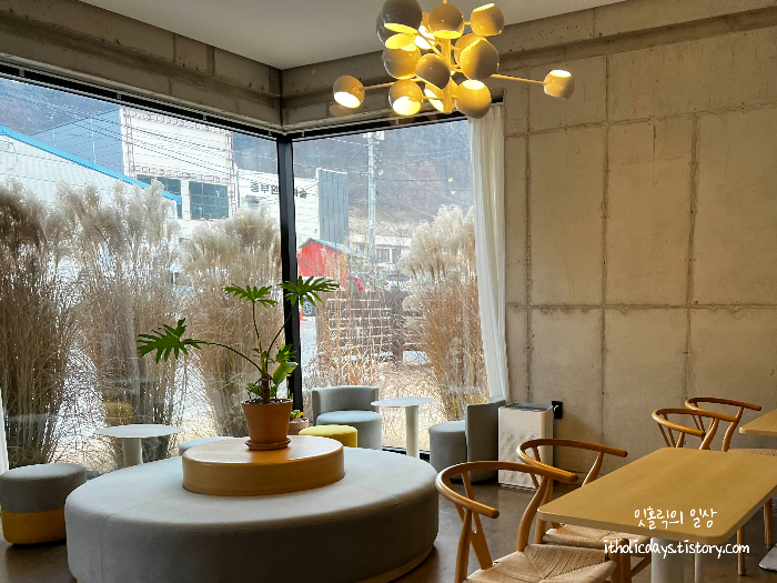 1층 테라스에 나가지 않아도 실내에서 1층의 전경을 즐길 수 있는 자리가 마련되어 있습니다. 밖은 갈대가 무성해서 잘 보이지는 않지만 유모차나 계단을 올라가기 힘드신 분들이 즐기실 수 있게 인테리어가 예쁘게 되어 있어요.