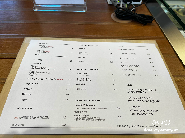 루엔커피 시그니쳐는 루엔 플로트(6,000원)와 루엔 커피(6,000원) 이고 커피류는 대부분 5,000원대예요. 에스프레소 뿐만 아니라 필터커피도 팔고 있는데 다른 커피보다 약간 비싸요(7,000원). 그래도 커피 종류가 다양해서 그날의 기분에 따라서 선택할 수 있는 옵션이 넓어서 좋습니다. 카페인 없는 녹차라떼나 과일티도 팔고 있어요. 특이하게 Steven Smith TeaMaker 브랜드의 허브티 메뉴가 준비되어 있습니다. 케이크 같이 곁들여 먹을 수 있는 메뉴들도 있어요. 특히 쑥케이크나 흑임자 서리태 가또 같은 메뉴를 먹어보고 싶었는데 밥을 먹고 가서 배불러서 못먹었어요 ㅜㅜ 흑임자 인절미 케이크나 쑥케이크가 시그니처인것 같으니 한번 시켜보는 것도 나쁘지 않은 것 같습니다.