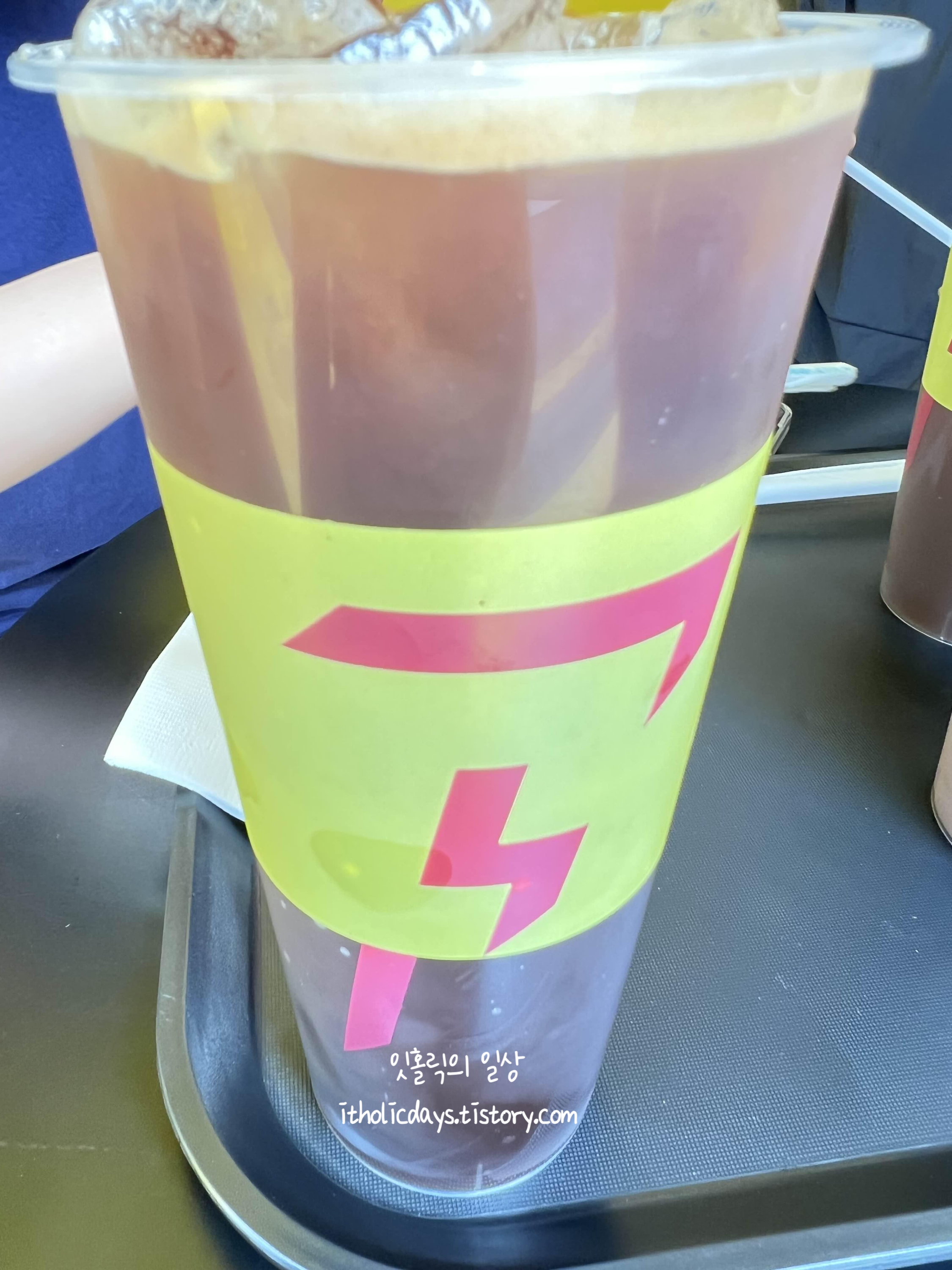 주문한 아이스 아메리카노가 나왔습니다! 맛은 솔직히 그냥 그랬는데 양이 많이 나와서 좋았어요. 사실 커피맛에 예민한 편은 아니라 일단 양이 많으니 만족도가 올라갔습니다 :) 일행은 레몬 샤케라토를 주문했는데 샤케라토는 레몬의 산미가 강해서 새콤 씁쓸한 맛이라고 하더라구요. 다른 핫플 카페들 처럼 대기가 있고 혼잡하고 그러지는 않아서 편하게 커피를 마시면서 사진찍고 놀기는 좋은 공간인 것 같았습니다!
