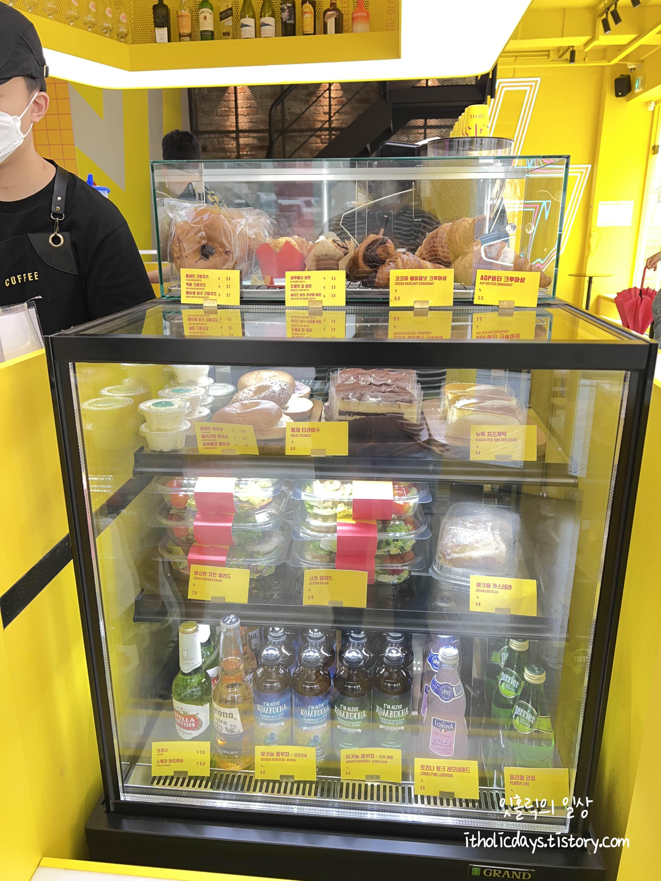 매장에서 음료류 뿐만 아니라 빵과 샐러드도 판매하고 있었습니다. 샐러드가 뭔가 신선해보여서 가격을 봤는데 저렴하지는 않더라구요. 시저 샐러드 하나에 6,900원이었어요. 하긴 스타벅스도 샐러드가 6,000원대 수준이니까 그렇게 비싼 편은 아닌 것 같긴 합니다. 요즘 물가가 많이 올라서 더 저렴하게 팔기 어려울 수도 있겠다는 생각도 들어요. 그런데 치킨 샐러드는 7,900원! 음료류가 제일 주문하기 편한 가격인 것 같았습니다. 그리고 특이하게 유기농 콤부차도 팔고 있었어요. 가격대는 좀 있지만 그래도 선택지가 넓어서 좋은 것 같습니다.