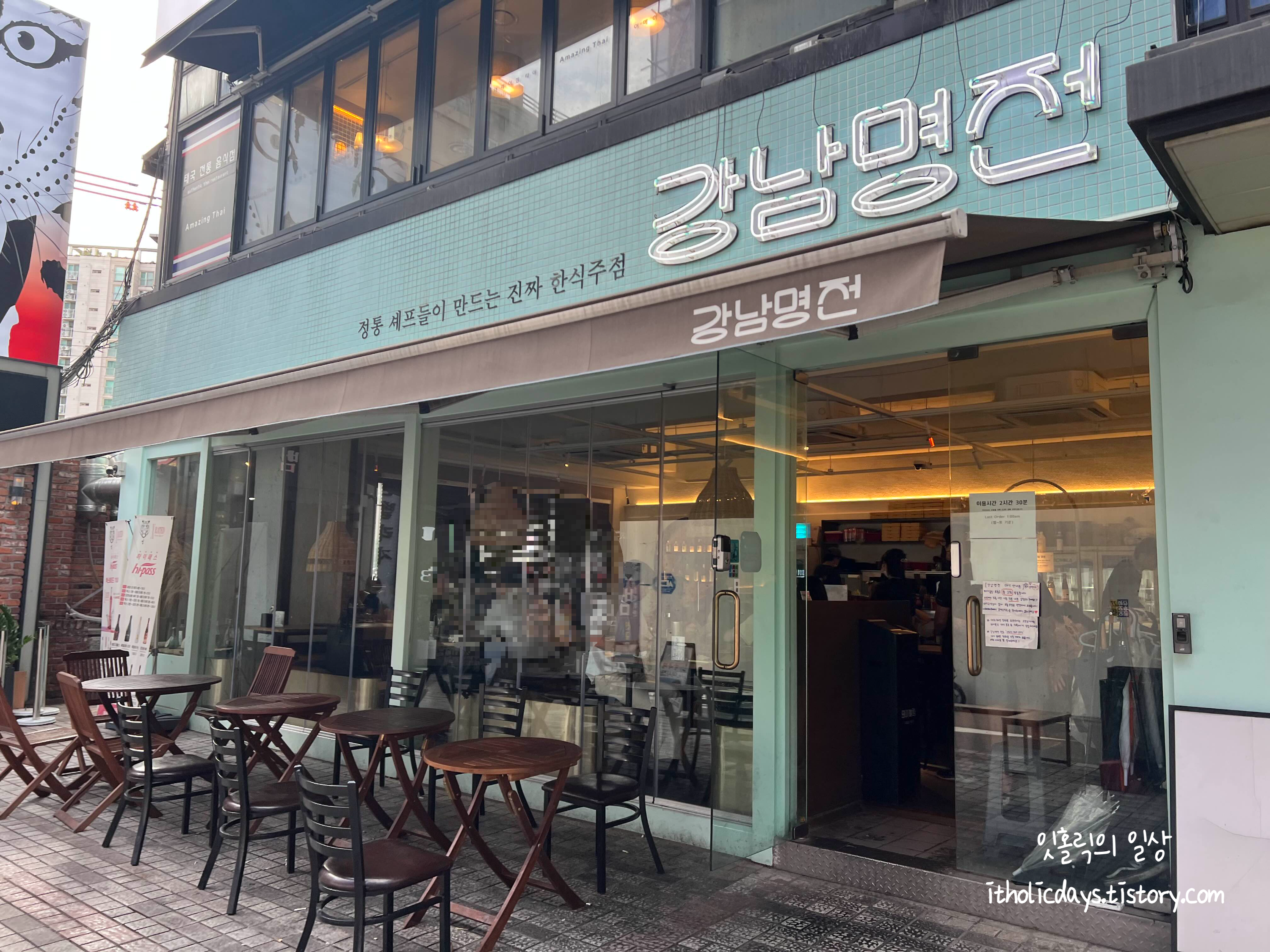 소나기가 한참 쏟아지다가 햇빛이 나왔다 비가 추적추적 왔다가 날씨가 변덕스러운 날, 퇴근 무렵에 막걸리에 전이 땡겨서 강남명전에 다녀왔습니다. 평일 5시 50분쯤 방문했는 데도 매장 안 4인 테이블은 벌써 다 만석이더라구요. 겨우 테이블이 하나 나와서 들어가서 앉았습니다. 밖으로 보기에는 한산해 보이는데 매장으로 들어가니 시끌시끌 사람들이 많았습니다.
