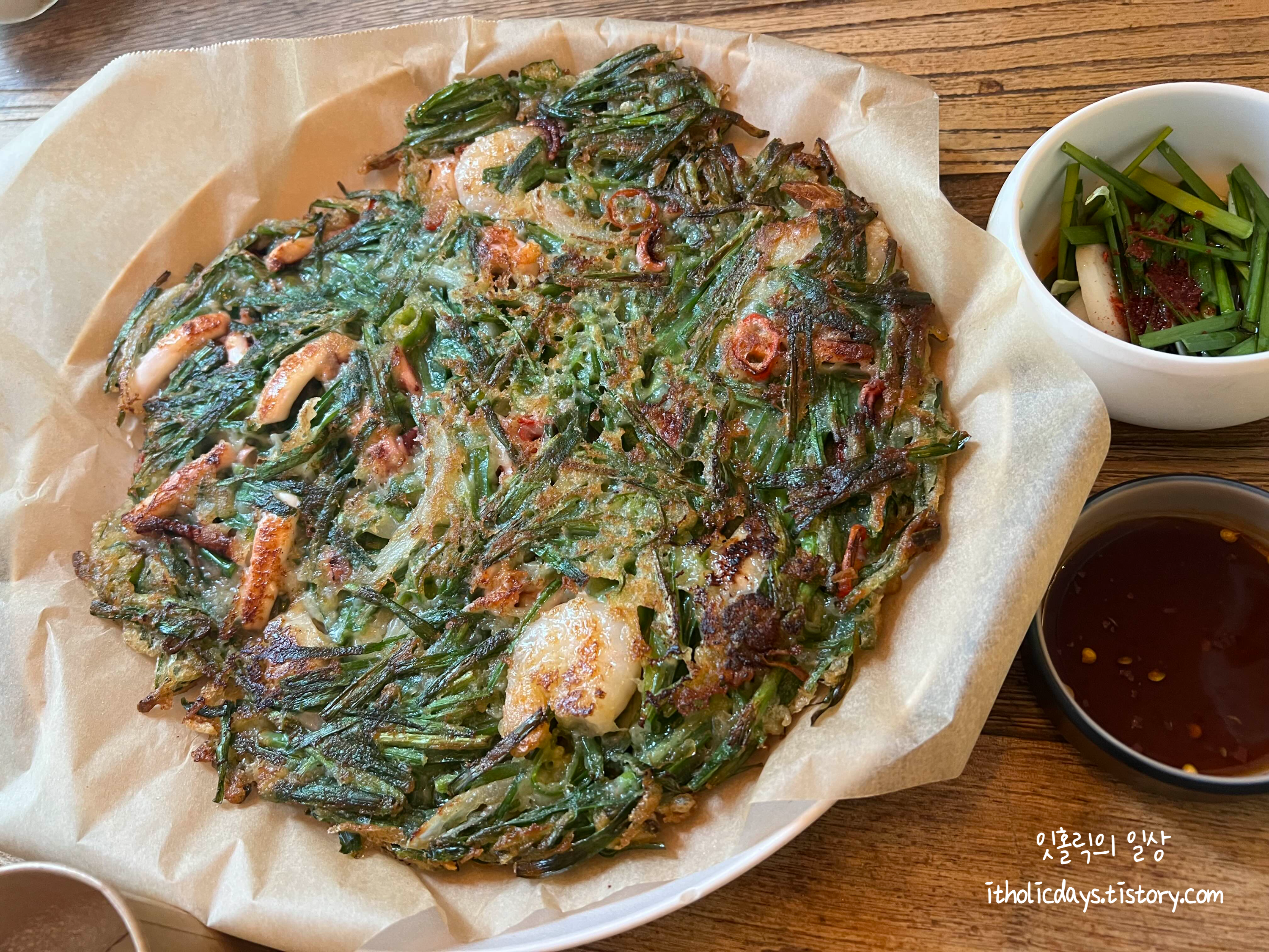 해물부추전도 주문했어요. 새우랑 오징어, 그리고 굴이 들어간 바삭하고 맛있는 전이었습니다!