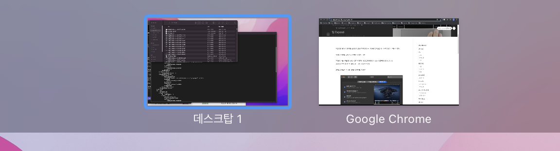 전체화면으로 창을 보고 있던 화면에서 기본 화면으로 이동을 한 뒤에 위의 Fn+F11 단축키를 누릅니다. 아래 그림에서 데스크탑 1로 이동을 한 뒤에 단축키를 눌러야 창이 일괄적으로 옆으로 치워지는 모션을 하면서 바탕화면을 보여줍니다. 전체화면으로 된 작업영역에서는 단축키가 안먹습니다.