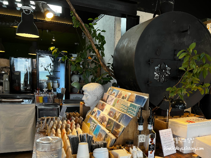 들어가는 문도 그렇고 카페가 뭔가 오래된 집 느낌으로 인테리어가 되어 있어서 뭔가 고즈넉한 분위기를 줍니다. 해풍에 벗겨진 것 같은 건물 외관이 세월의 흐름이 느껴지는 것 같은 건물입니다. 그래도 바닷가 쪽은 유리로 되어 있고 문을 열어놓고 있어서 카페 내부가 아늑하면서도 개방감이 있습니다.