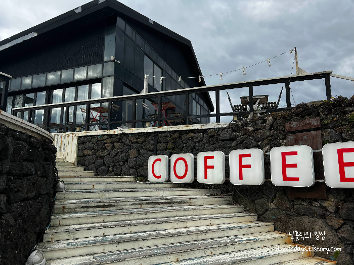 세화 바닷가를 산책하다가 구좌 당근주스를 마시러 세화해변에서 잘보이는 카페 라라라에 가봤습니다. 해변 멀리서도 잘 보일 정도로 건물이 커서 찾아가기가 너무 쉽습니다. 하늘에 먹구름이 잔뜩 낀 날이었지만 비는 오지도 않고 해서 살짝 비올까봐 걱정되기도 했어요. 먹구름이 좀 지나가기를 기다리면서 들어갔습니다.