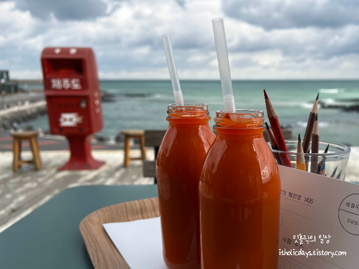바다가 잘 보이는 테이블에 앉았습니다. 구좌 당근주스는 뭔가 색도 컬러풀하면서 건강해지는 맛이라 금새 마셨어요. 한 세 잔 정도는 연달아 마실 수 있을 정도로 맛있습니다. 연필과 엽서를 주시는데, 엽서를 써서 우체통에 넣으면 정말 적힌 주소로 엽서가 보내진다고 하네요. 바닷가도 그렇고 분위기가 레트로한 느낌이 나서 친구와 옛날 이야기를 하면서 한참 바다를 보다가 나왔습니다. 세화 해변도 그렇고 카페 라라라도 그렇고 한적한 분위기가 힐링이 되는 곳이었습니다. 물론 핫한 시즌에 오면 여기도 사람들로 북적이겠지만요. 그래도 너무 예쁜 세화 해변과 맛있는 구좌 당근주스를 마시러 한 번 들러보세요.