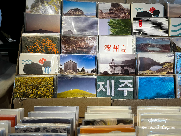 카페에서 제주 엽서나 굿즈들을 모아놓고 팔고 있었습니다. 자세히 물어보지는 않아서 오리지널 굿즈도 있는지는 잘 모르겠지만 제주도의 풍경이나 분위기가 담긴 엽서에 글도 쓸 수 있었어요.