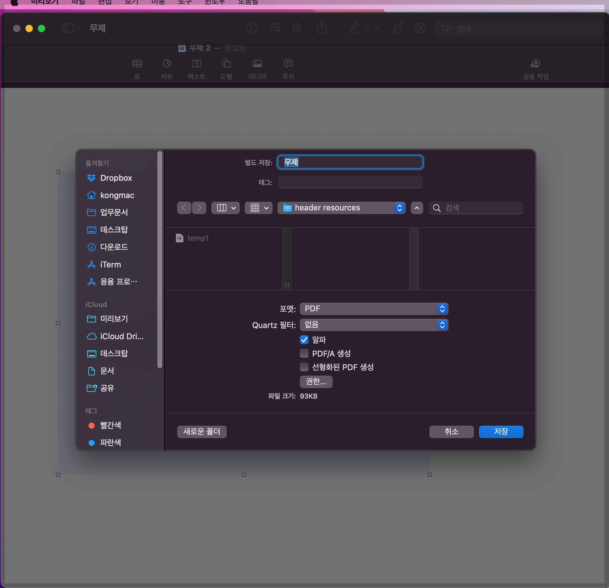 저장할 위치를 설정하고 파일이름을 선택한 뒤, 저장할 포맷을 선택하고 저장버튼을 클릭하면 끝납니다. 포맷은 PDF, HEIF, JPEG, PNG, TIFF 등의 옵션을 지원합니다. 이미지로 사용하고 싶다면 JPEC이나 PNG로 저장하면 됩니다.
