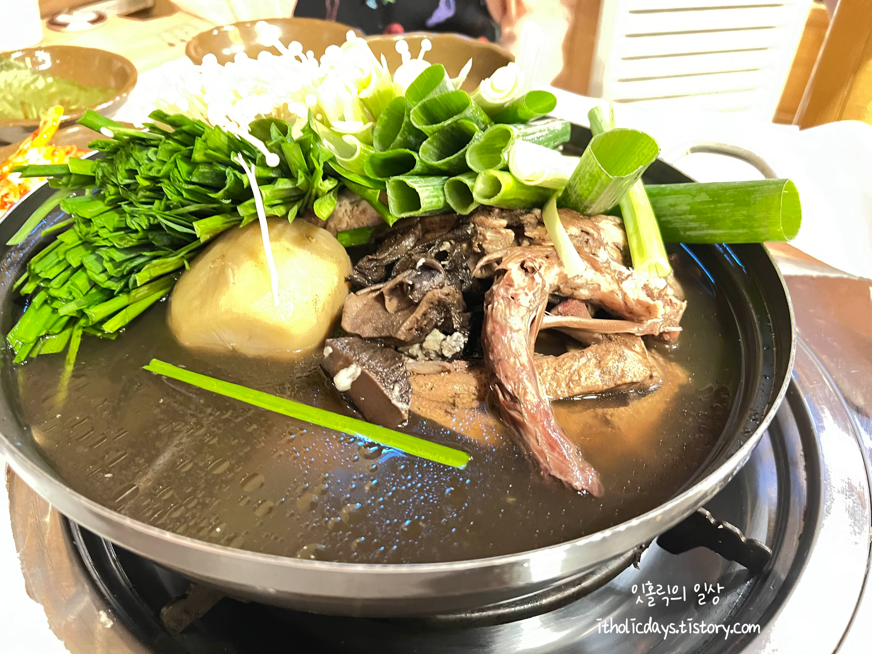 저희는 인원이 좀 되다 보니 토종닭 백숙탕과 누룩지 백숙을 주문했습니다. 백숙탕을 불 위에 올려주셨는데 미리 탕을 고와서 감자랑 파 같은 고명을 얹어서 내주시는 것 같았어요. 국물이 진하고 닭이 부드러워서 정말 맛있습니다. 특히 국물이 너무 맛있어서 계속 흡입하게 됩니다.