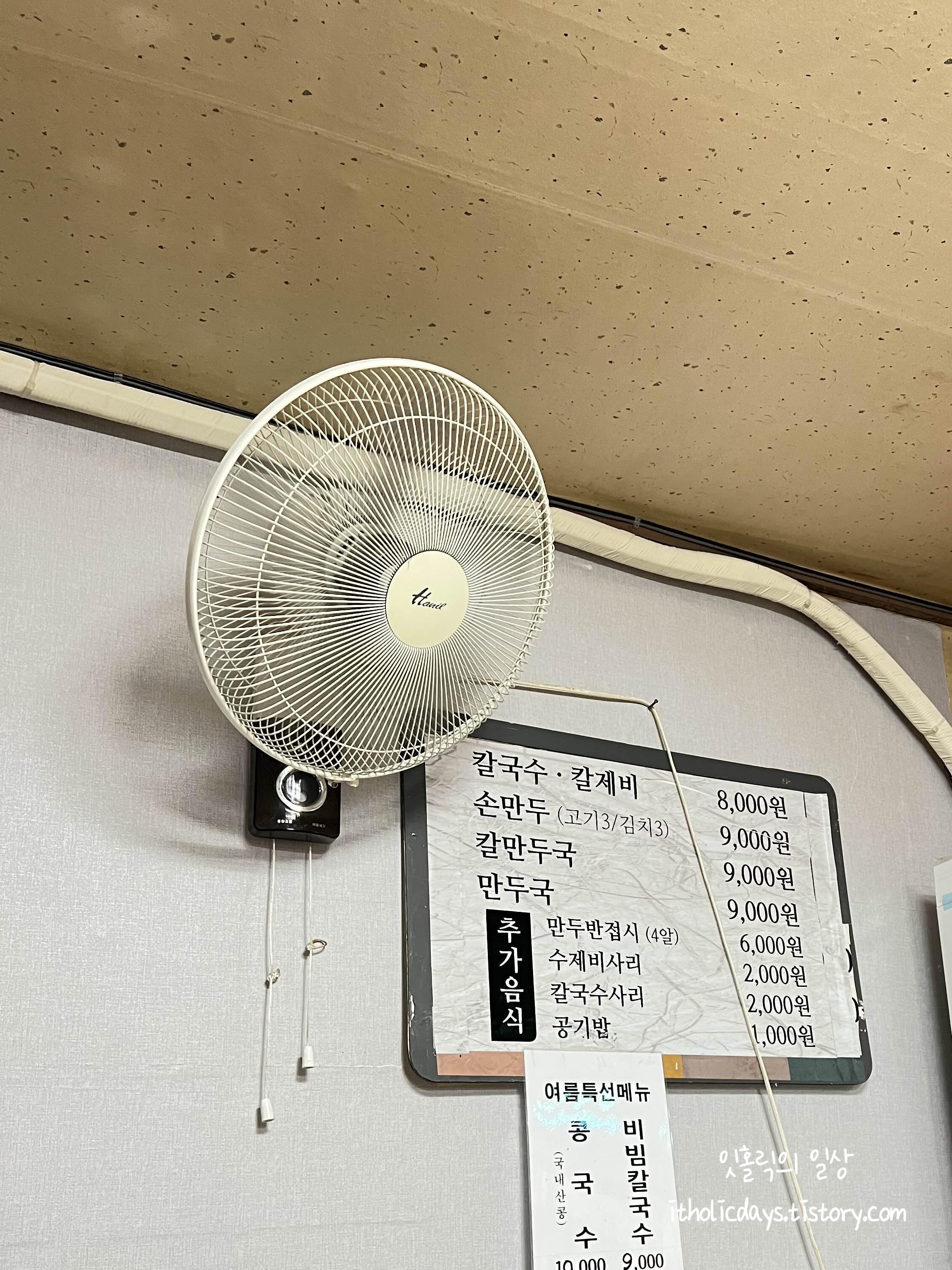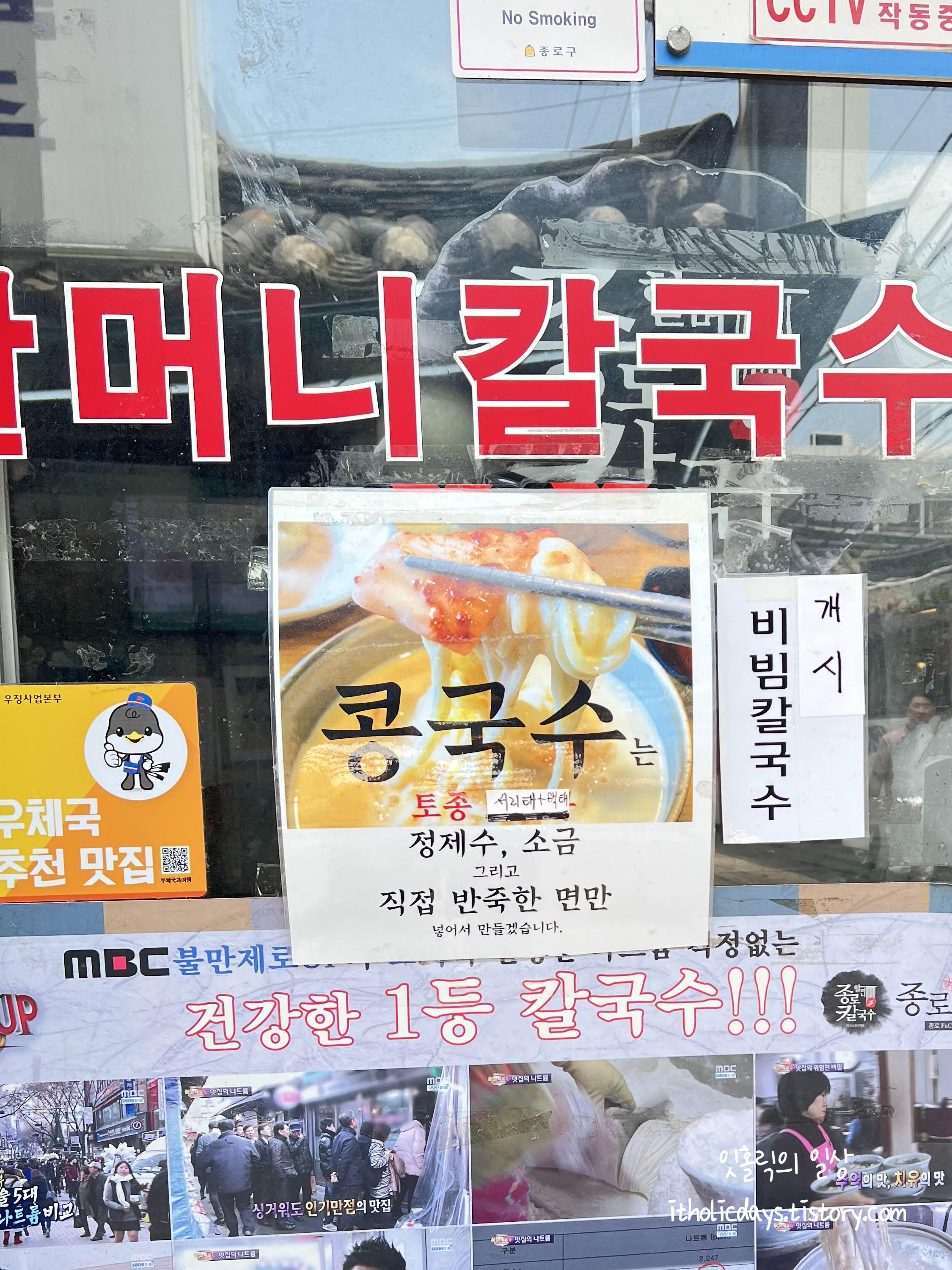 종로할머니칼국수 식당 출입문 옆에 콩국수와 비빔칼국수도 판다는 안내가 붙어있네요. 종로할머니칼국수는 처음 방문하는 거라 칼국수를 먹으러 왔지만 다음번에는 시원하게 콩국수를 먹어보고 싶네요.