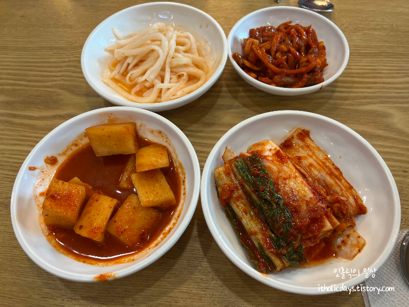 밑반찬은 다 매콤해보이는 김치류가 위주로 준비되어 있어요.