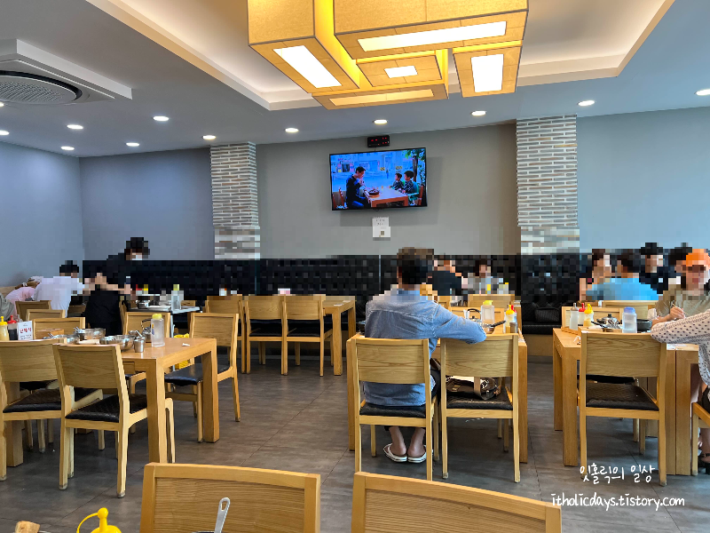 드디어 테이블에 앉았어요. 한시 넘어서 갔더니 저희가 앉을때가 되니 테이블이 하나 둘 씩 비더라구요. 점심 때라서 대기가 많았던 것 같습니다. 티비에는 방송에 강남면옥이 나온 장면이 계속 편집해서 재생되더라구요. 연예인이랑 같이 먹는 느낌으로 보라는 걸까요..?