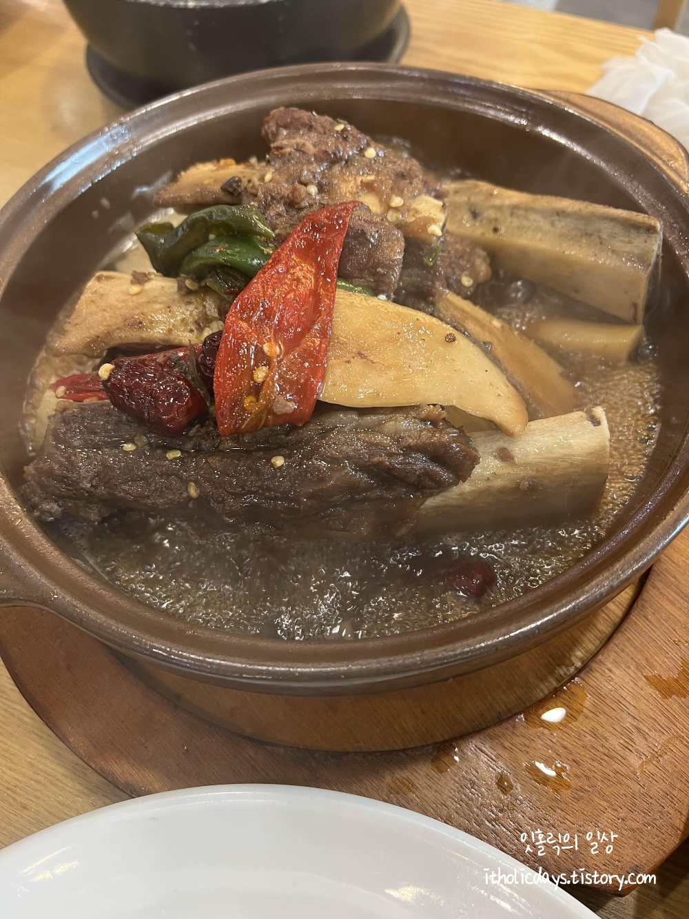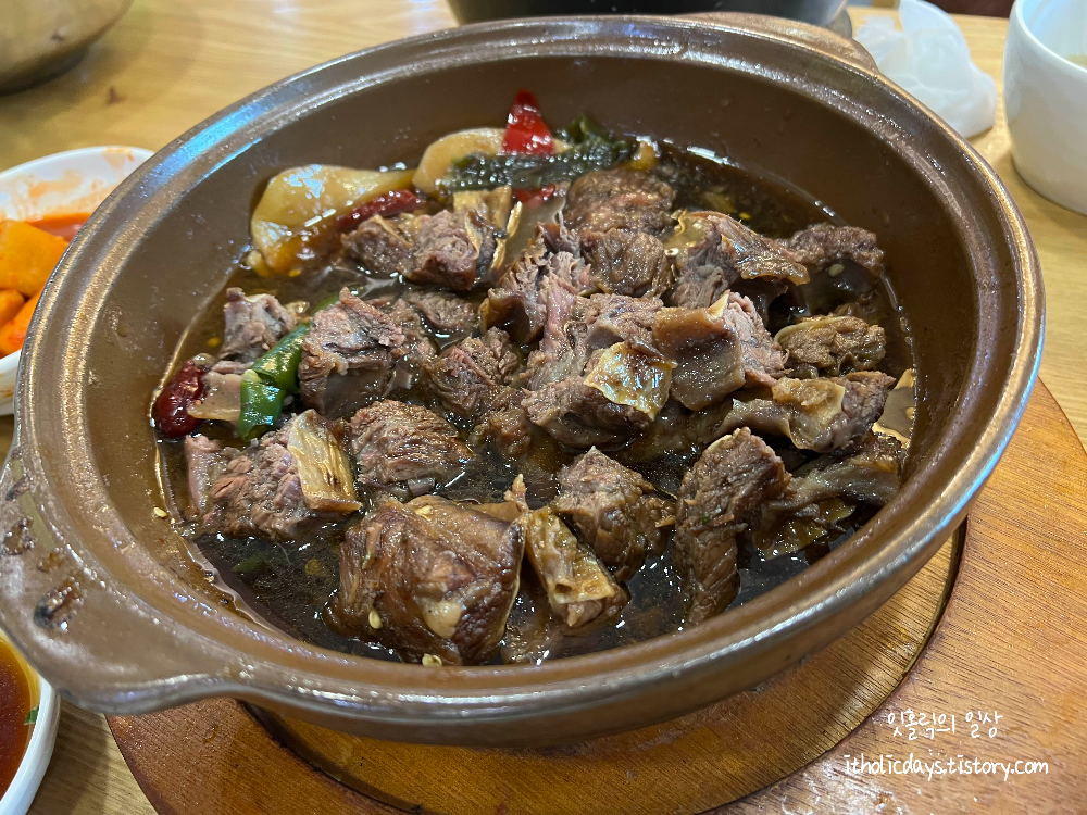 갈비찜은 소자인데도 푸짐하게 나옵니다. 세 명이서 방문했는데 배불리 먹을 수 있었어요. 냉면과 만두를 추가로 주문해서 그런지는 모르겠는데 양이 부족하지 않았습니다. 고추가 들어가서 달달하기 보다는 약간 칼칼한 느낌의 갈비찜입니다. 개인적으로 단 갈비찜은 좋아하지 않아서 꽤 마음에 들었어요. 고기도 부드러워서 먹기가 편했습니다.