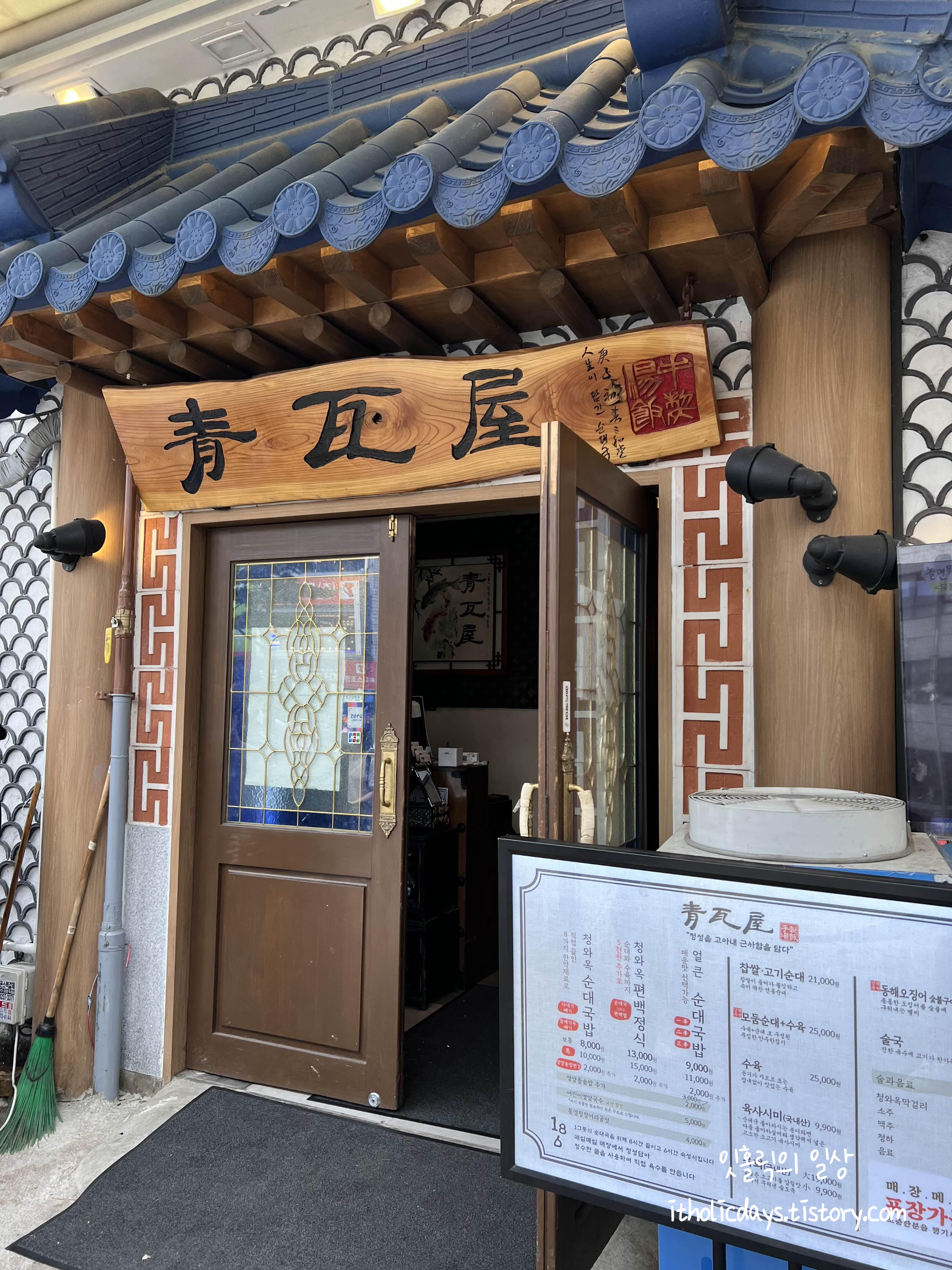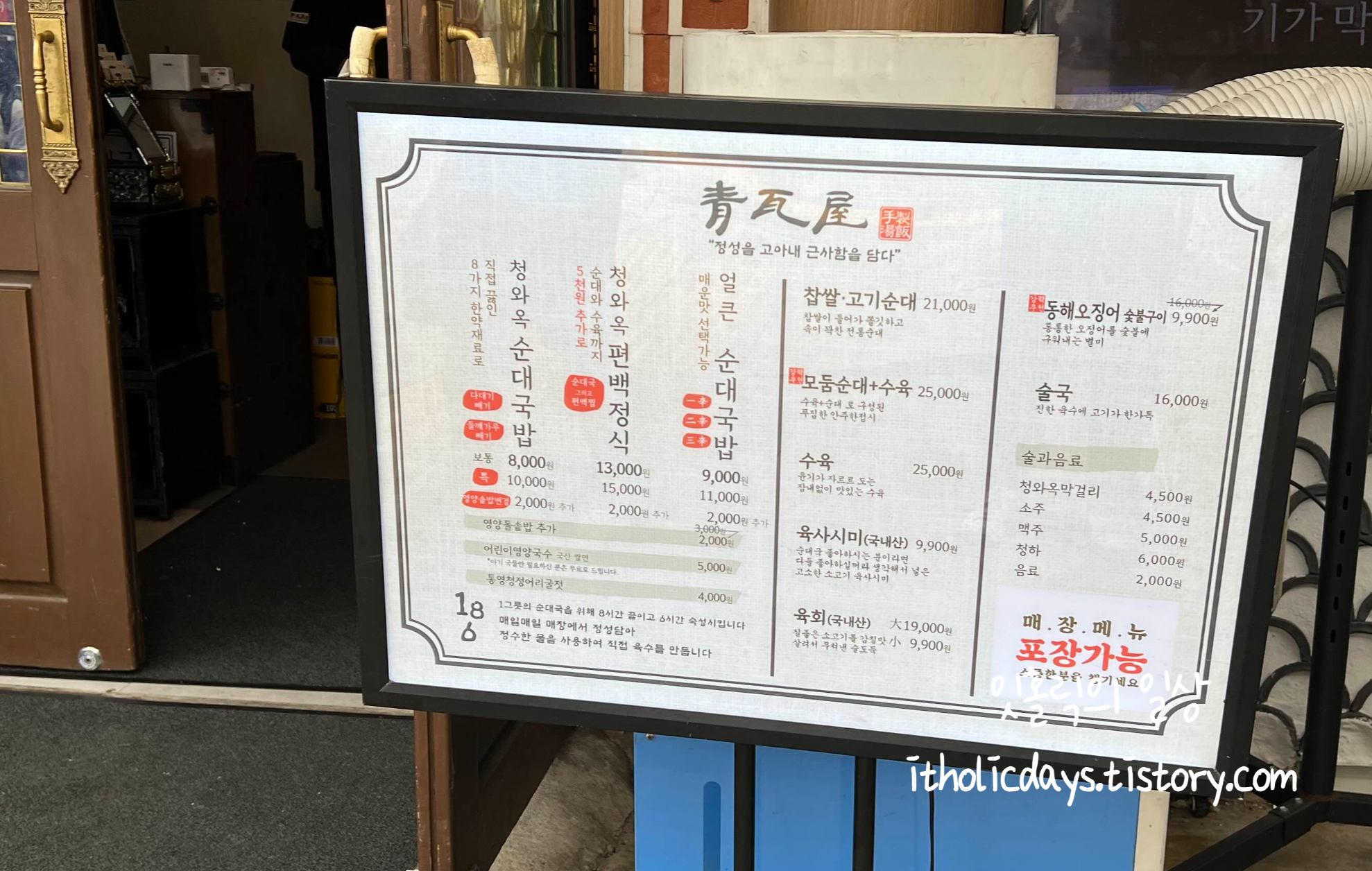 가게 앞에서 대기할때 메뉴로 뭘 먹을까 미리 생각해볼 수 있어요. 메뉴가 청와옥 순대국밥 8,000원, 편백정식이 13,000원 순대국밥이 9,000원 정도 하고 고기순대가 21,000원이고 동해오징어 숯불구이가 9,900원 정도 합니다. 수육(25,000원)이나 육사시미(9,900원)도 팔고 있어요. 특이하게 순대국밥의 맵기를 선택할 수 있습니다 :)