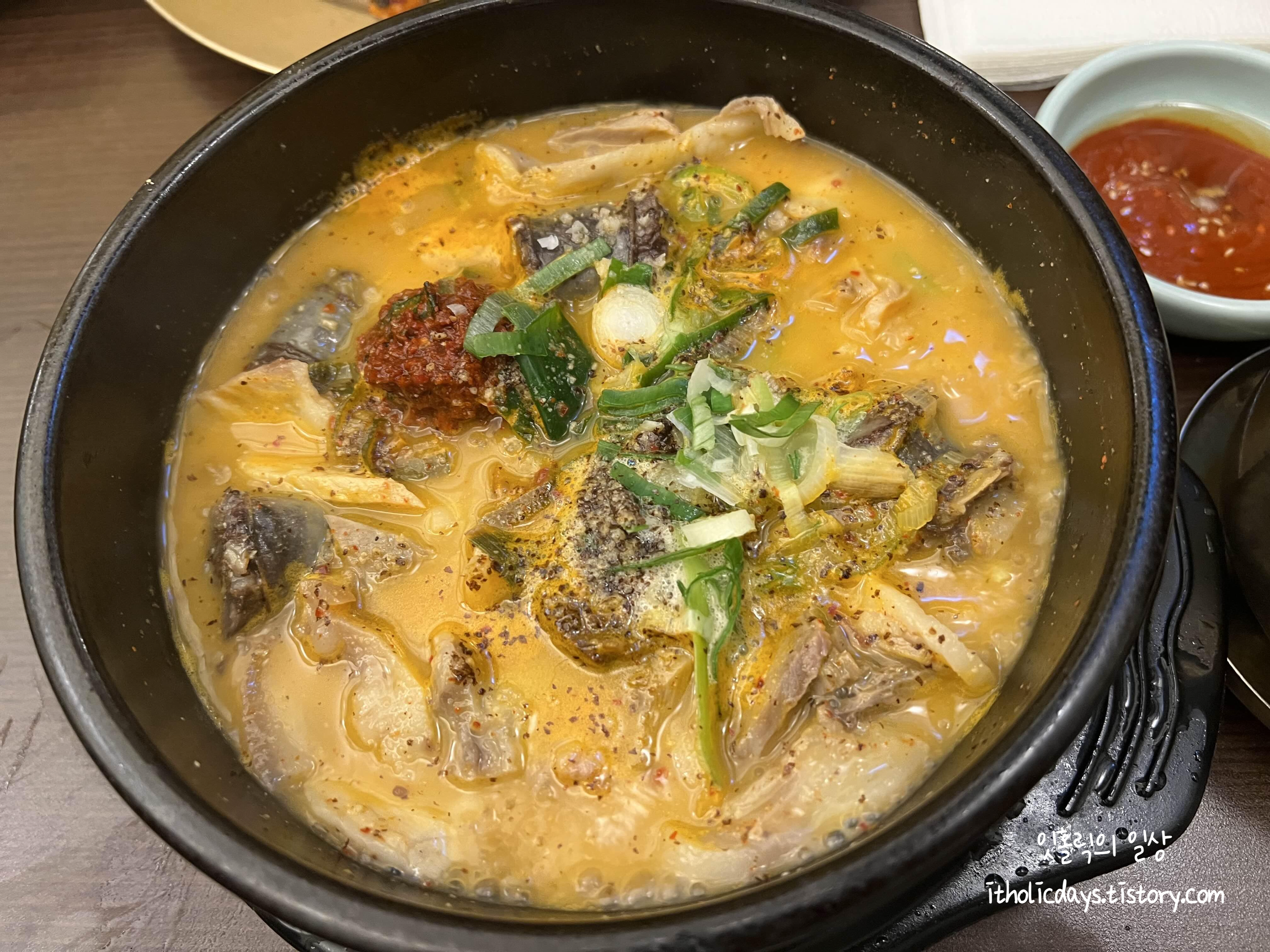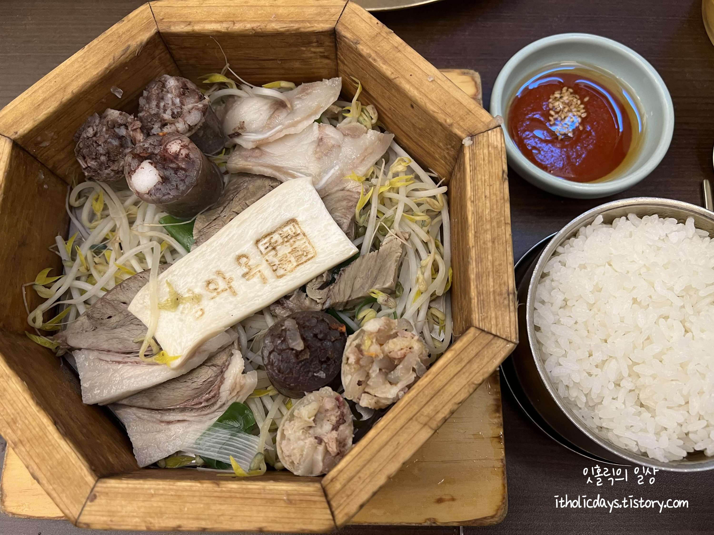 편백정식에 세트로 묶여있는 순대국이예요. 순대국에 약간 매콤한 양념장이 들어서 나오는데 별로 매운 양념이 아니고 살짝 칼칼한 느낌만 주는 정도입니다. 순대국에도 순대랑 고기가 많이 들어가서 배가 엄청 부릅니다. 편백찜을 먹고 순대국밥까지 먹으면 과식했다는 생각이 들 정도로 배불러요. 양이 많지 않으신 분들은 편백정식을 주문할때 순대국 특으로 하면 다 못 먹고 나올 확률이 높습니다. 아무튼 순대국밥집인데도 깔끔한 편백찜을 같이 먹을 수 있어서 상당히 혜자인 곳이예요. 주위에 청와옥을 안가본 사람이 있으면 꼭 데려가고 싶은 곳입니다. 방문할때 식사시간에는 대기가 좀 있을 수 있으니 살짝 일찍가거나 늦게가는걸 추천합니다.