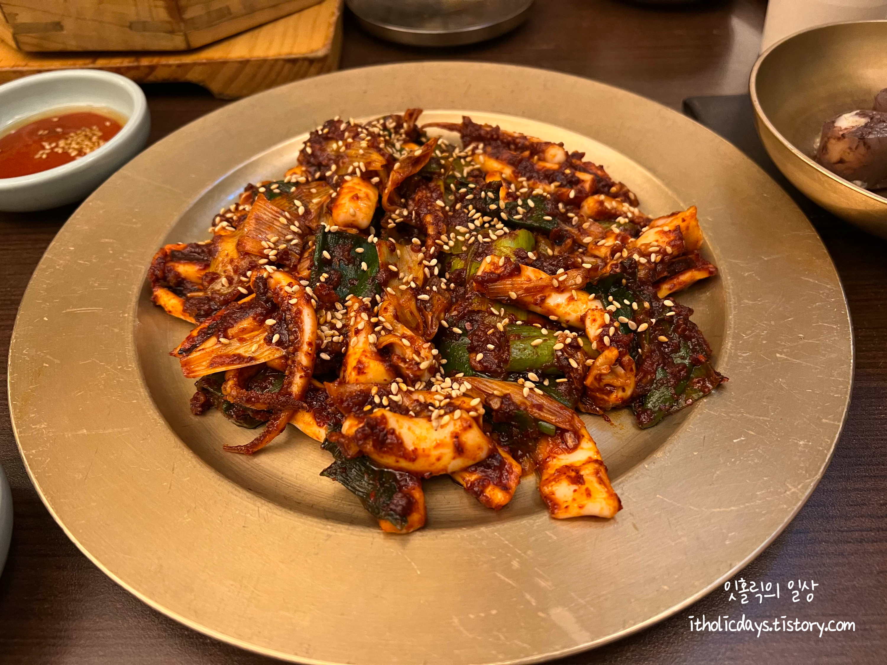 편백정식만 먹으면 아쉬울 것 같아 동해 오징어 숯불구이도 주문했어요. 보기에는 굉장히 매울 것 같은 빨간 양념인데 먹으면 의외로 안맵습니다. 오징어가 숯불구이되서 더 식감이 탱글하고 씹는 맛이 좋아요. 불밋이 살짝씩 올라와서 더 맛있습니다.