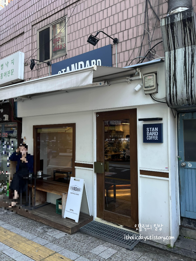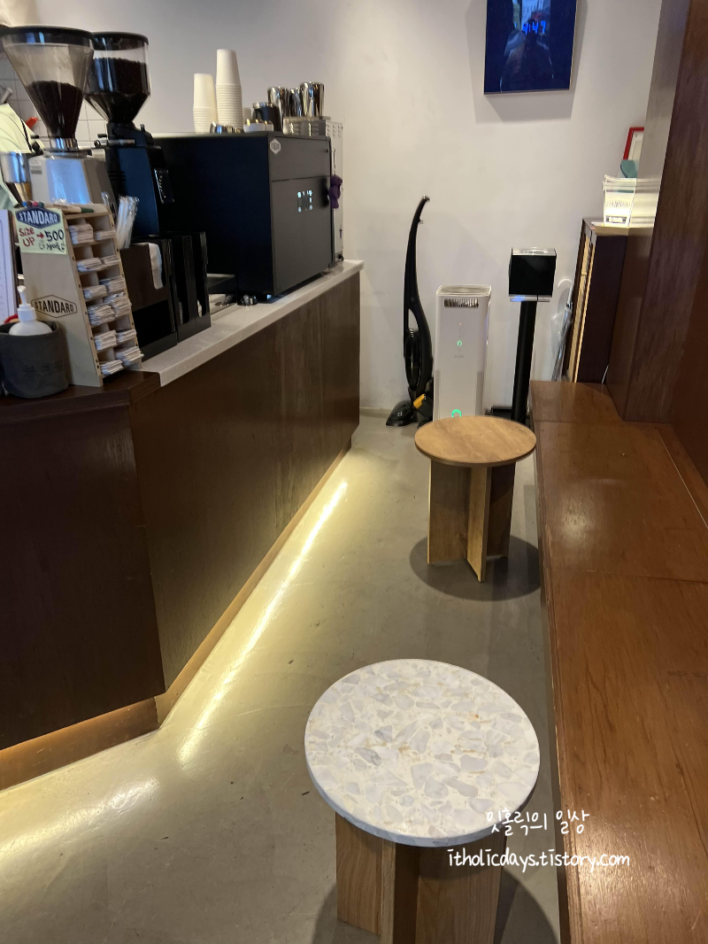 충무아트홀에 뮤지컬을 보러 올 때 마다 아트홀 1층에 있는 스타벅스를 주로 갔었는데 오랜만에 방문했다가 새로운 커피숍을 발견했어요. 스탠다드라는 카페인데 입구부터 뭔가 힙한 느낌의 인테리어라 그냥 지나칠 수 없습니다. 매장 앞에 조그맣게 테라스 석을 마련해 놓았어요. 매장 내부도 테이블 석이 2개 정도 되고 벽쪽에 일렬로 앉아서 마실 수 있는 테이블이 두 개정도 되는 아주 작은 가게예요.