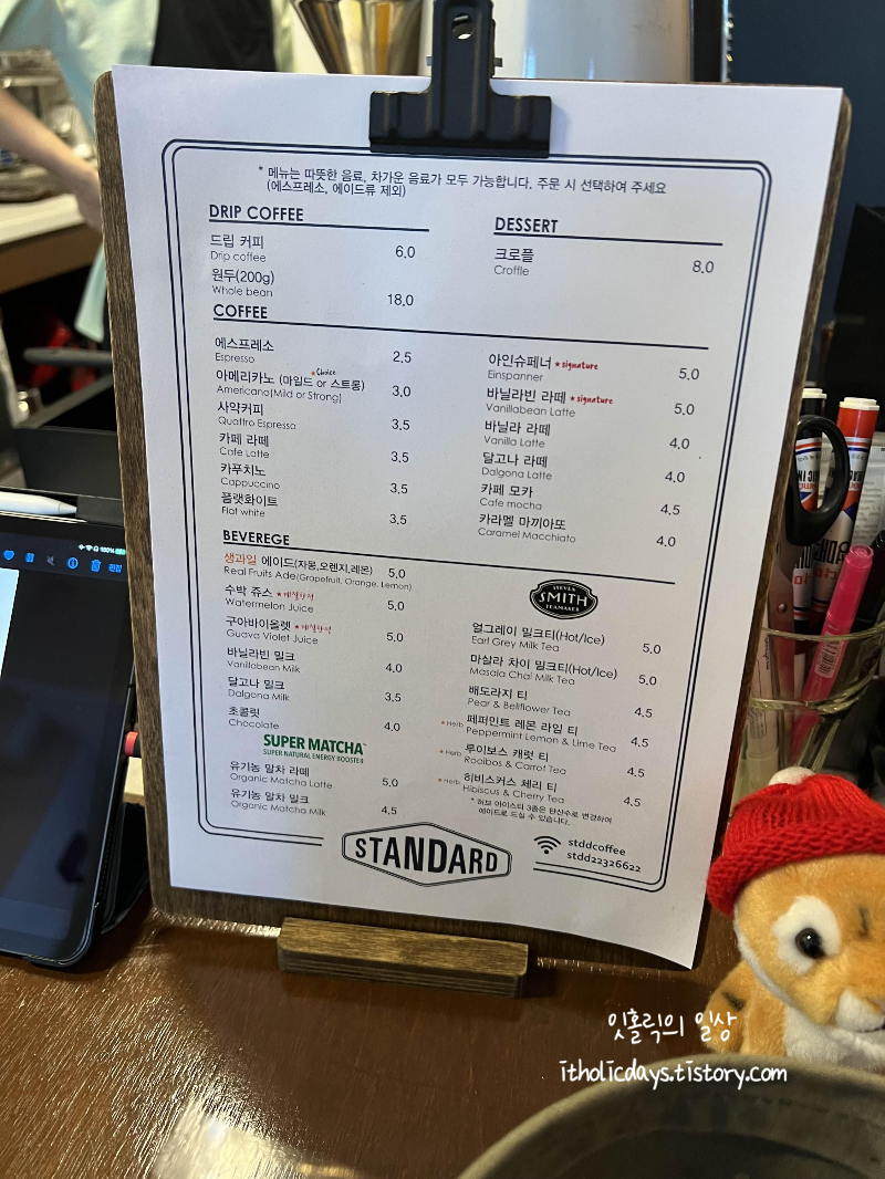 가게는 작지만 메뉴가 다양했어요. 아메리카노가 3,000원 정도예요. 좋은 점이 커피 종류도 다양하고 카페인 없는 음료도 많이 팔아서 취향에 맞게 메뉴를 선택할 수 있는 점이예요. 홍차 종류도 6가지나 되고 녹차 좋아하시는 분들을 위해 말차 라떼(5,000원)나 말차 밀크(4,500원)도 팔고 있습니다.