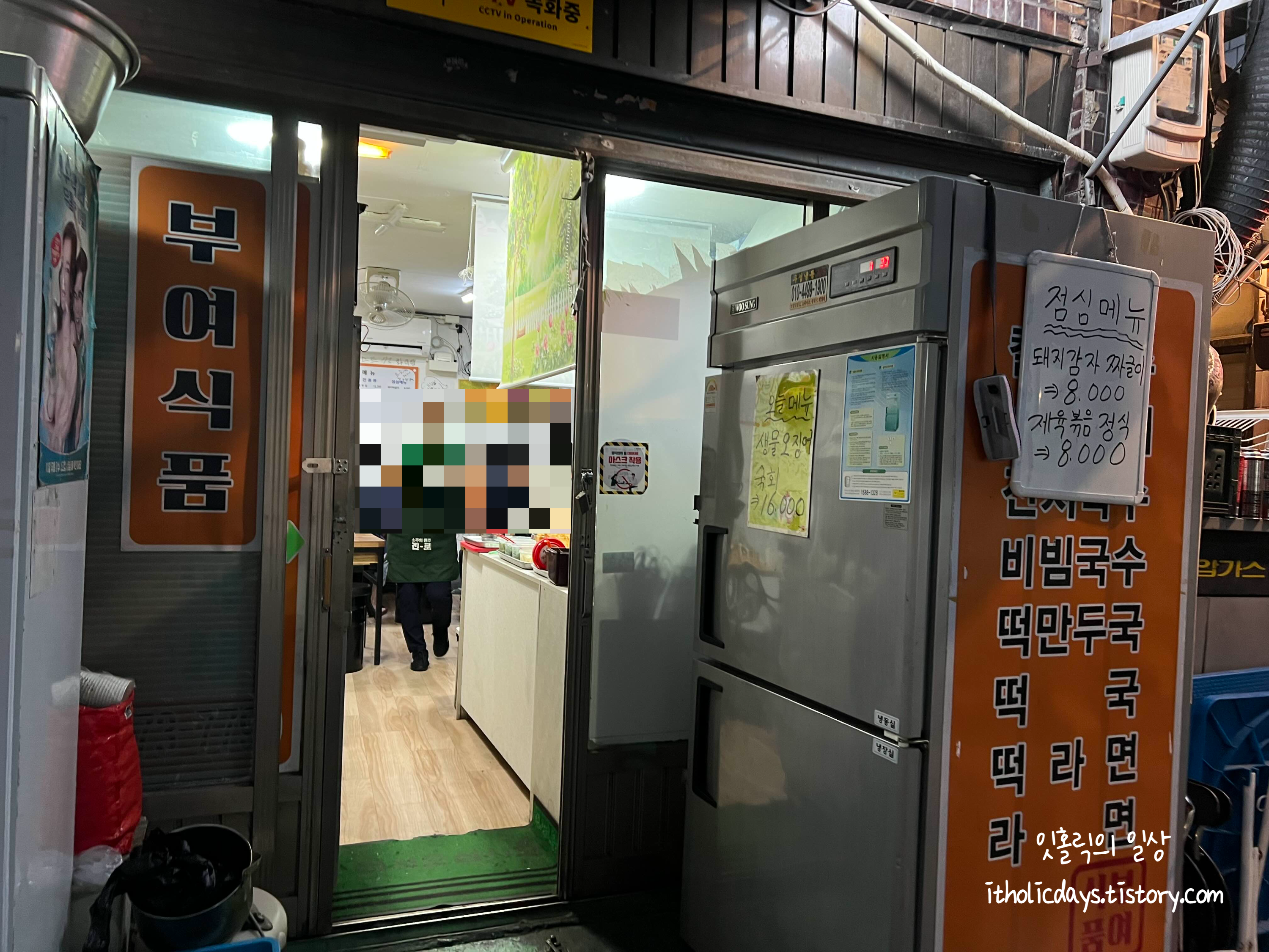 부여식품 매장은 골목길 한켠에 큰 간판 없이 자리하고 있어서 못 보고 지나칠 수도 있는 거리에 있어요. 그래도 가게가 조그맣지는 않습니다. 사람들이 많아서 눈길이 가요. 옛날 느낌이 물씬 나는 인테리어예요.