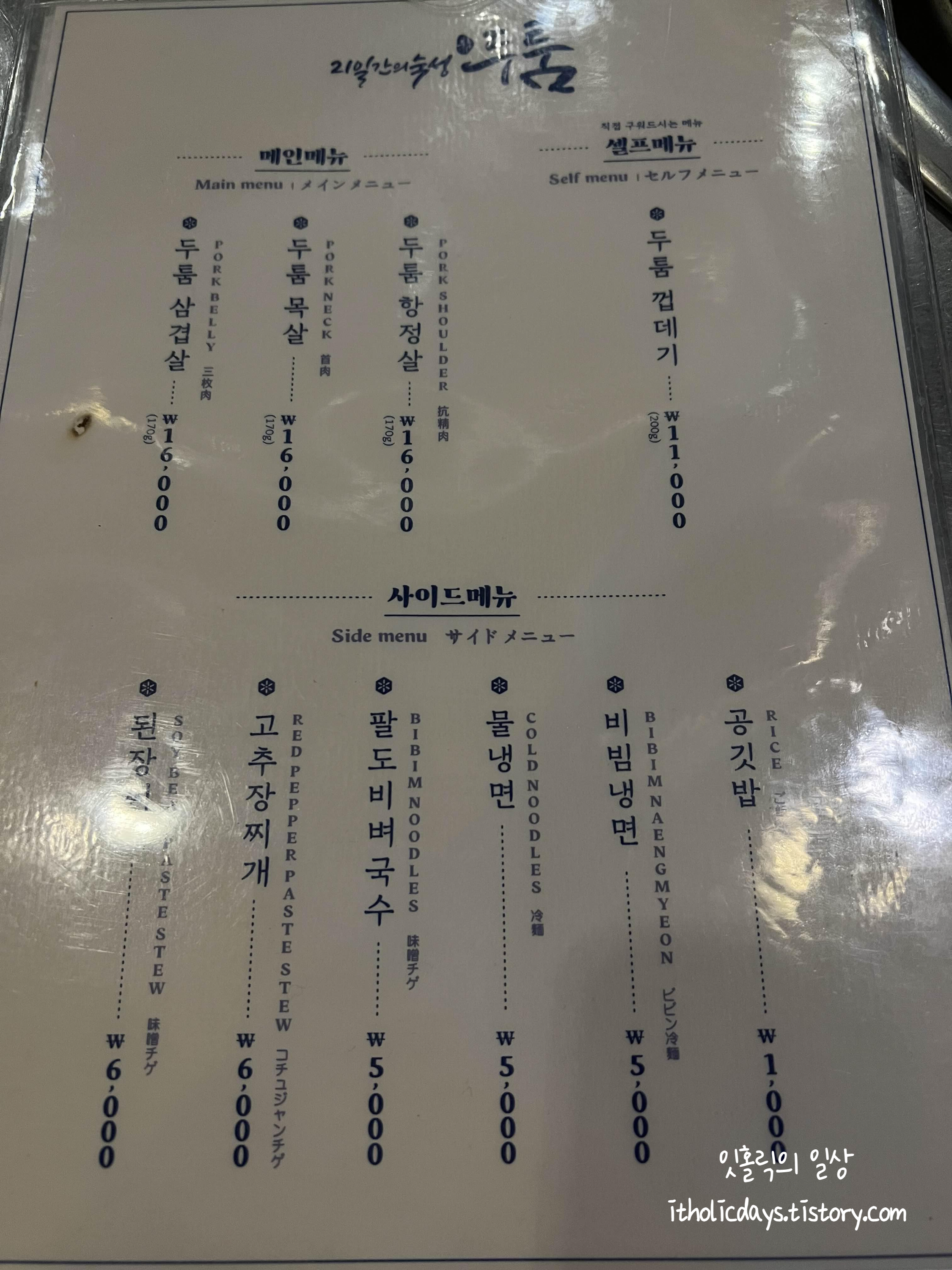 숙성이라서 그런지 아니면 요즘 물가가 많이 올라서 그런지 생각했던 것 보다는 가격이 그렇게 저렴하지는 않습니다. 두툼 삼겹살, 목살, 항정살이 모두 170g에 16,000원입니다. 특히 껍데기가 11,000원이라서 조금 비싸다고 생각했던 것 같아요. 다른 집은 껍데기에 8,000원 수준이었던 걸로 기억하거든요. 그래도 고추장찌개가 6,000원이고 냉면류가 5,000원이라서 엄청 비싸지는 않은 것 같습니다. 평균적인 가격인듯 해요. 껍데기는 조금 비싸지만요. 숙성고기라 그런지 부드럽고 맛있어서 평소보다 과식할 수 있으니 찌개를 빨리 시켜서 배를 좀 채우는 것도 추천드려요. 고추장찌개가 특히 매콤해서 고기랑 먹기 딱 좋습니다.