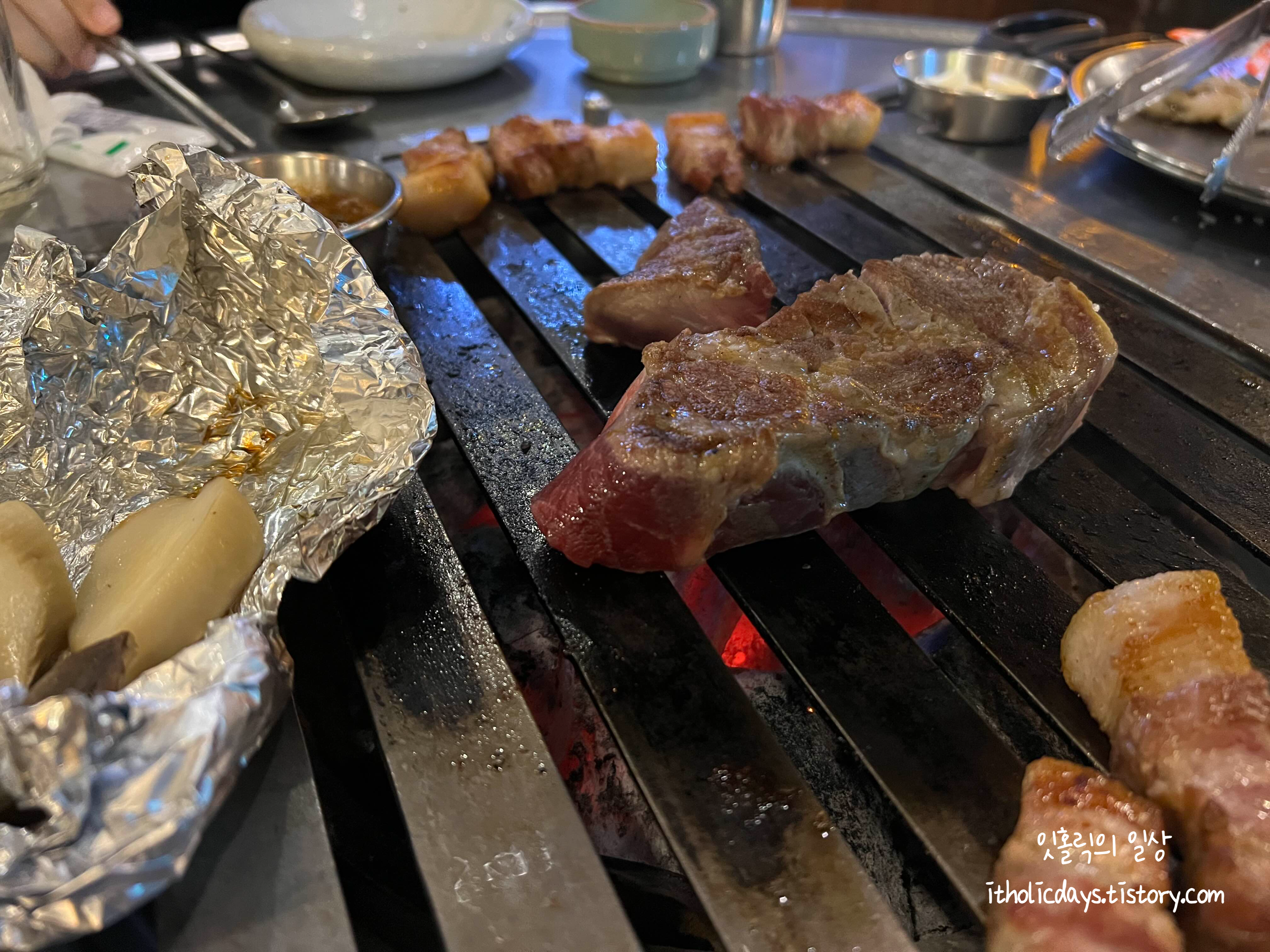 주문하니 금방 고기가 나왔네요. 삼겹살이 두툼하게 썰려서 나옵니다. 직원분이 다 구워주셔서 편하게 먹을 수 있어요. 가운데에 있는 은박지는 버섯이예요. 고구마인줄 알았는데 말이죠. 불판도 두꺼워서 불판에 잘 눌러붙지 않습니다. 고기가 질기지 않아서 좋았어요.