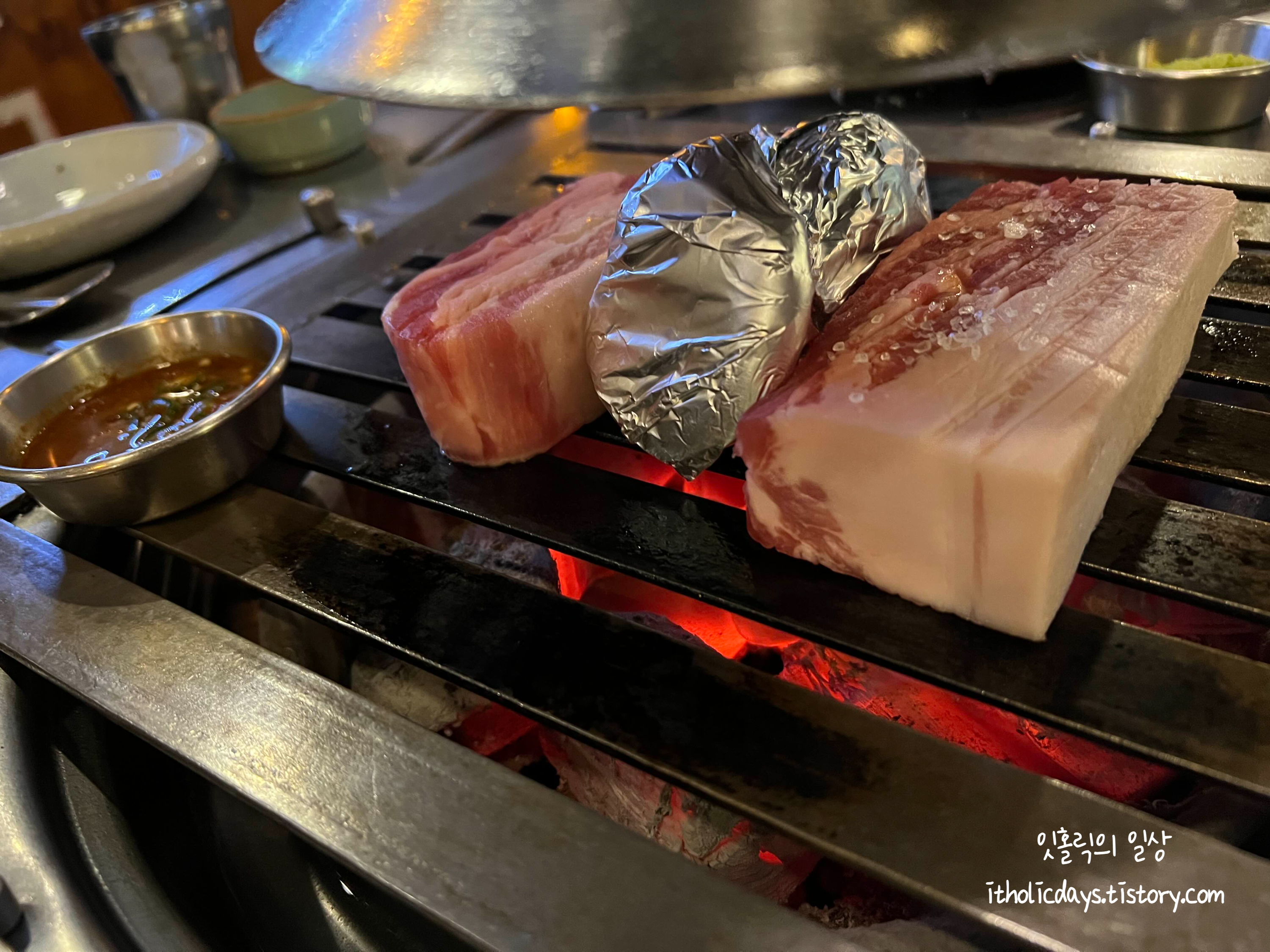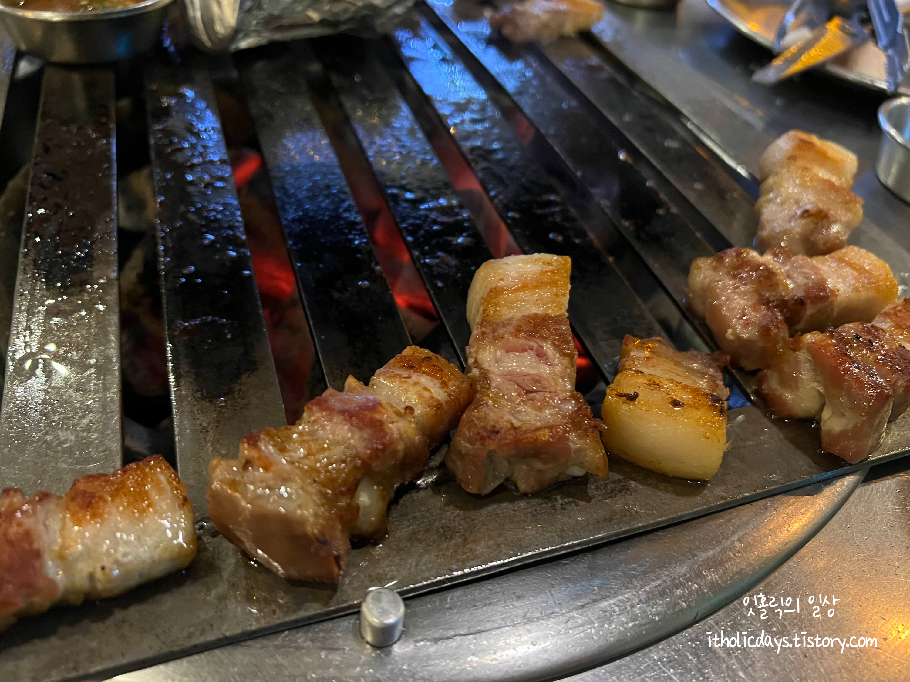 삼겹살 먹고 목살도 먹었는데 퍽퍽하지 않고 삼겹살처럼 부드러운 식감이라 먹기가 편했습니다. 목살에 지방이 많이 없는데도 질기지 않아서 놀랐어요. 삼겹살이 진리이긴 한데 다음번에는 목살을 더 먹어보고 싶었습니다. 매장 내부가 전체적으로 오래된 느낌의 인테리어로 테이블에 숯을 넣어서 고기를 직접 구어주셔서 모임으로 가기 좋은 집이예요. 이야기하면서 구어주시는 고기를 먹기 딱입니다. 위치도 충정로랑 서울역 사이에 있어서 천천히 걸어가면 역사 어느쪽에서 걸어가든지 금방 도착하는 거리에 있습니다.