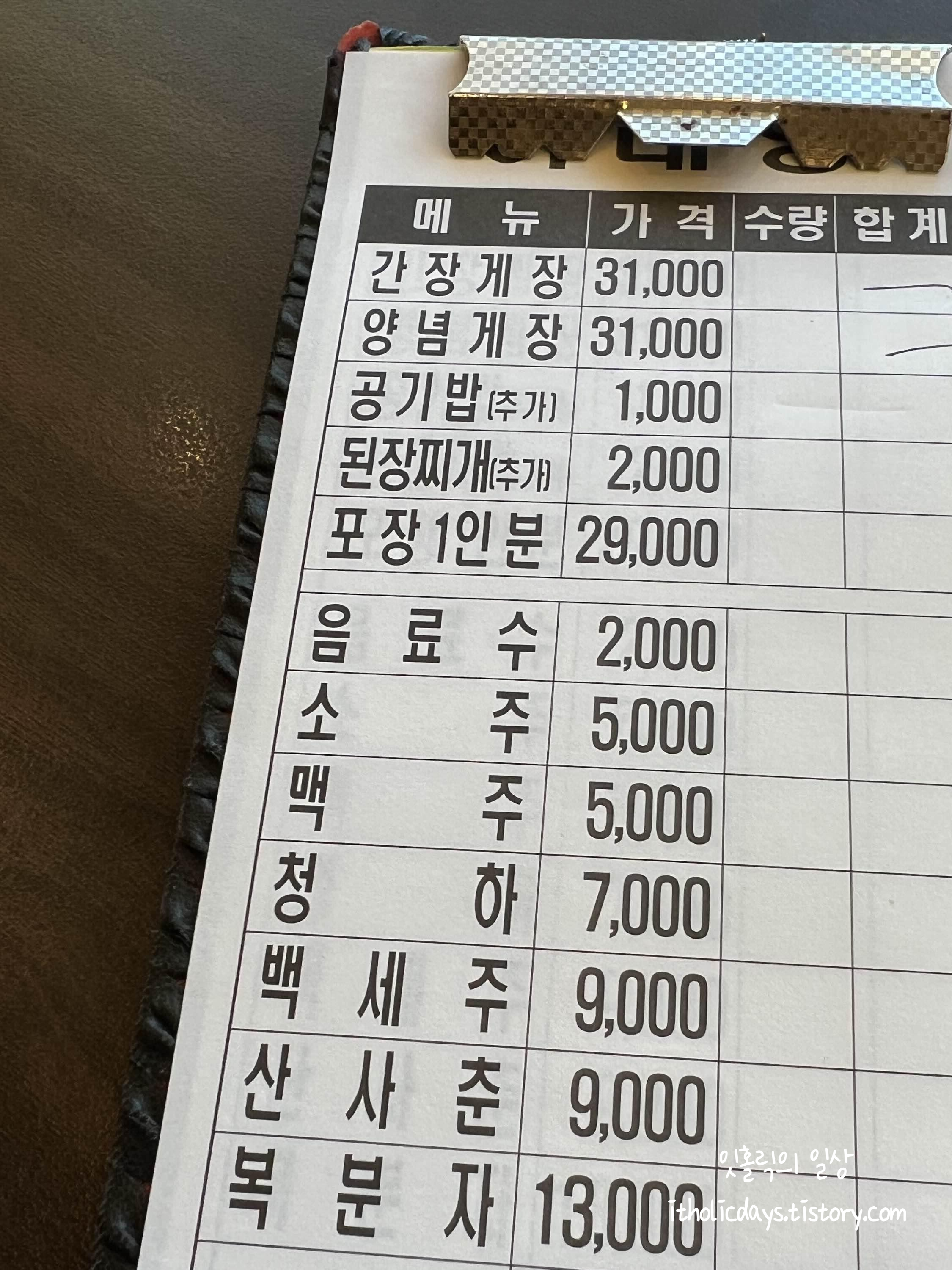 주 메뉴인 간장게장과 양념게장이 31,000원이고 나머지 추가로 공기밥이 1,000원, 된장찌개가 2,000원 이네요. 생각했던 것보다 가격이 2-3,000원 정도 비싸서 살짝 놀라긴 했어요. 사이드로 먹을 수 있는 메뉴도 많이 없어서 아쉬웠구요. 그래도 일단 게장집에 왔으니 간장게장 1인분과 양념게장 1인분을 주문했습니다.