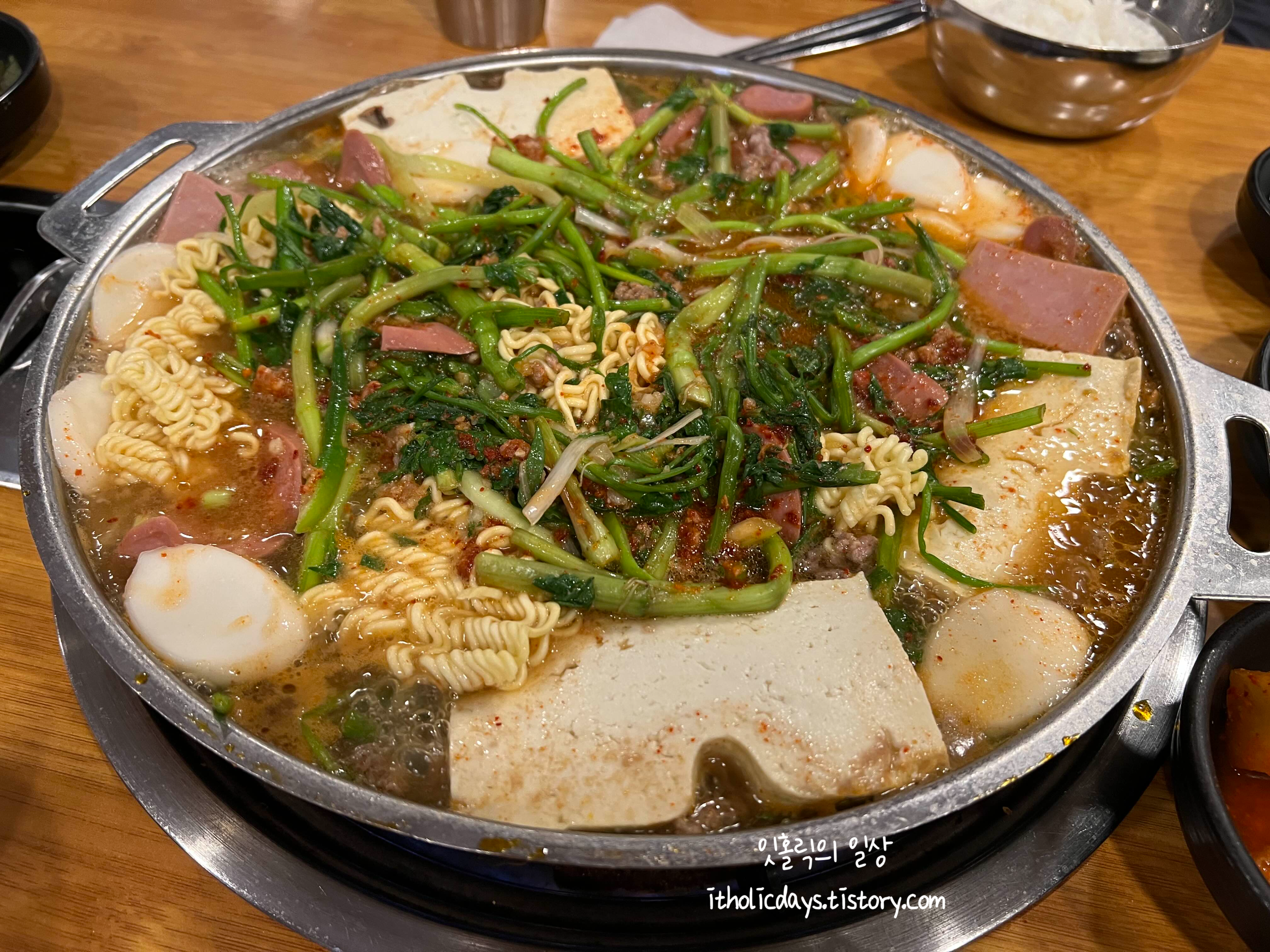 저희는 그냥 부대찌개를 주문해서 라면사리를 추가했습니다. 부대찌개를 주문하면 미나리를 듬뿍 얹어 주세요. 부대찌개를 먹는데도 건강식을 먹는 것 같은 기분이 듭니다. 덜 짜기도 하구요. 블루리본 받은 만큼 엄청 맛있어서 눈이 튀어나올 정도는 아닌데 평범하게 맛있는 한끼 먹을 수 있는 맛입니다. 부대찌개 좋아하시는 분들은 한번 들러서 드셔보셔도 후회하지는 않을 맛이예요. 자극적이지 않아서 자주 가서 먹고 싶어지는 맛입니다.