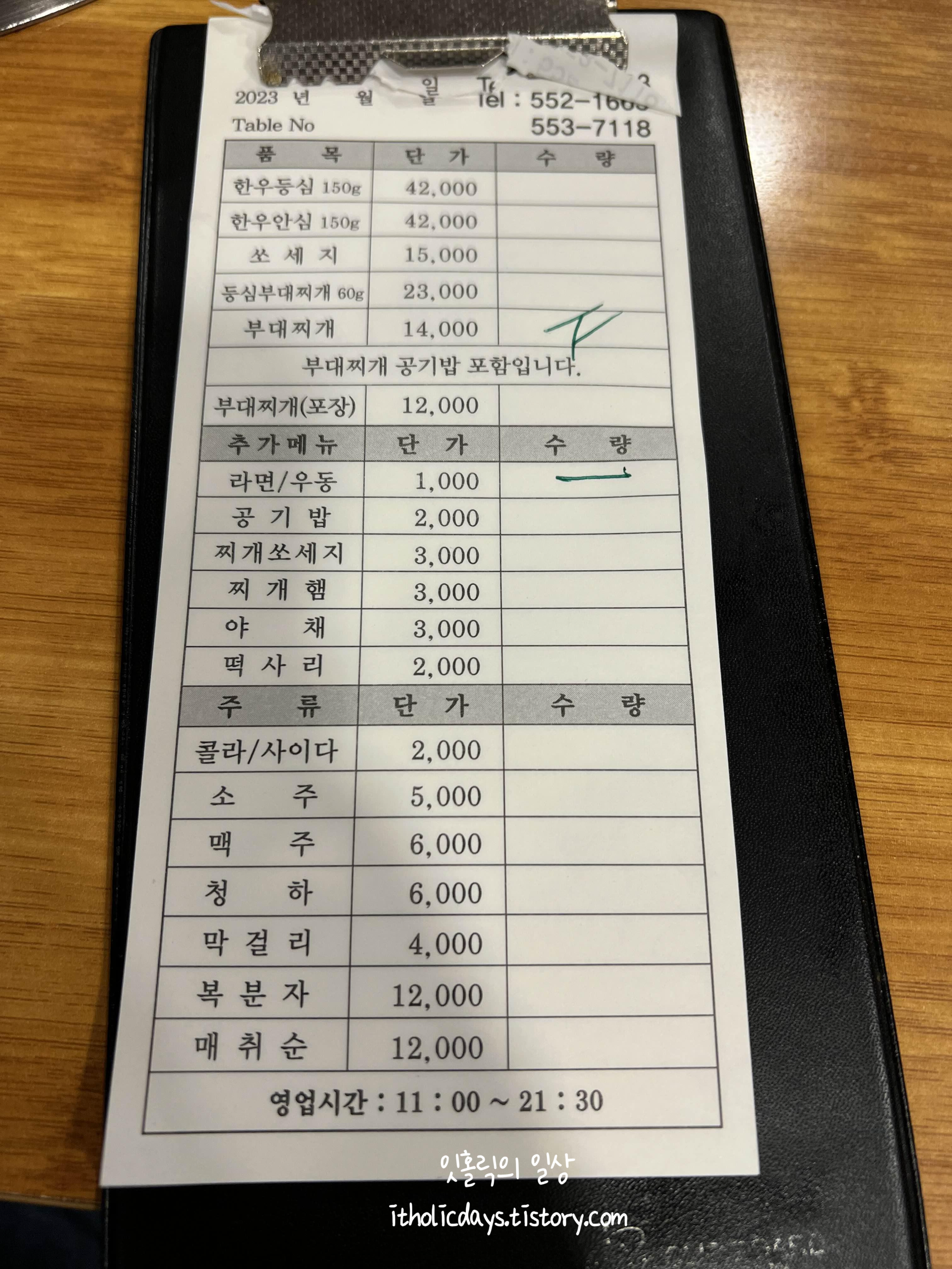 주문표에 추가 사리 가격이 나와있어요. 라면(1,000원), 공기밥(2,000원), 찌개쏘세지(3,000원) ,찌개햄(3,000원), 야채(3,000원), 떡사리(2,000원)인데 요즘 물가가 올라서 사리를 주문할때 가격을 다시 확인해야 합니다. 식당 가보면 예전 가격으로 적어둔 곳도 많거든요. 요즘 물가가 무서워서 밖에서 밥을 먹기가 겁나네요.