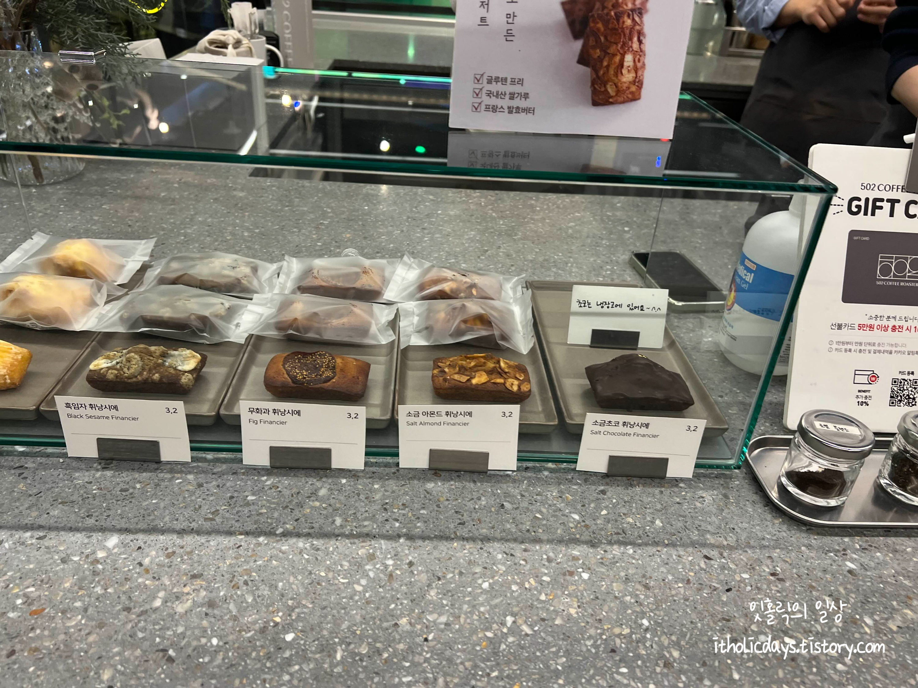 베이커리류도 팔고 있는데 휘낭시에가 3,200원 정도로 팔고 있고 흑임자 휘낭시에, 무화과 휘낭시에, 소금 아몬드 휘낭시에, 소금초코 휘낭시에 등등 커피와 같이 맛볼 수 있는 휘낭시에들이 나란히 줄지어 있습니다. 저는 점심을 먹고 가서 간단히 공단커피를 마셔봤습니다. 공단 커피는 카카오, 다크초콜릿의 깊고 진한 단맛의 강배전 커피라고 설명을 읽었는데 메뉴 이름 때문인지 유난히 쓰게 느껴지더라구요. 공단커피를 들고 일하러 가야하는 슬픈 운명... 다음엔 좀 더 달달한 아인슈페너를 마셔봐야겠어요.