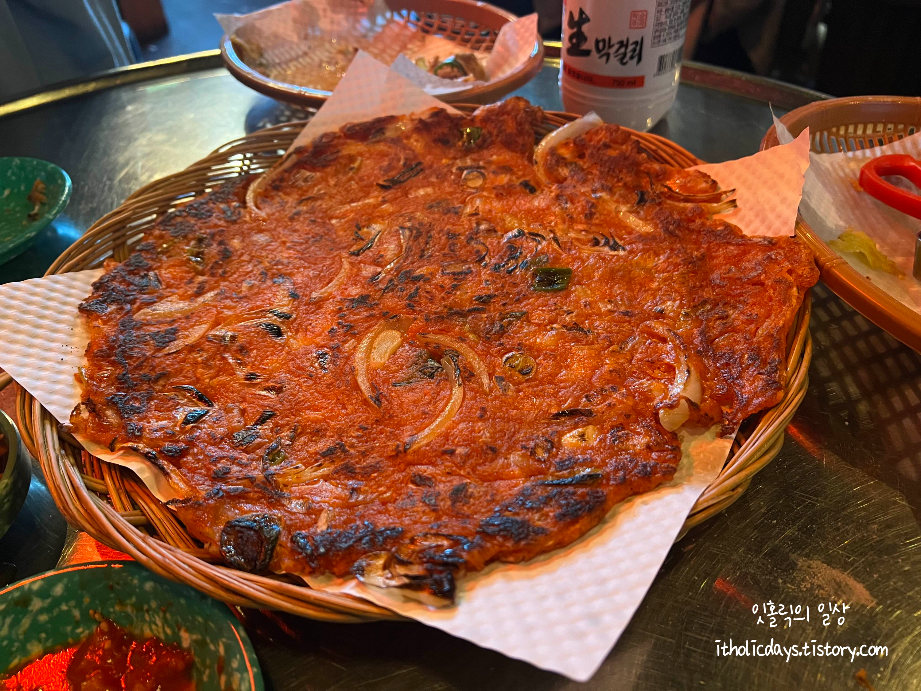 김치전도 큼직하게 부쳐서 나옵니다. 군데군데 탄 곳이 있지만 바삭해서 맛있어요. 김치가 살짝 신것 같긴 한데 새콤한 김치전 좋아하시면 맛있게 드실 수 있는 김치전입니다.