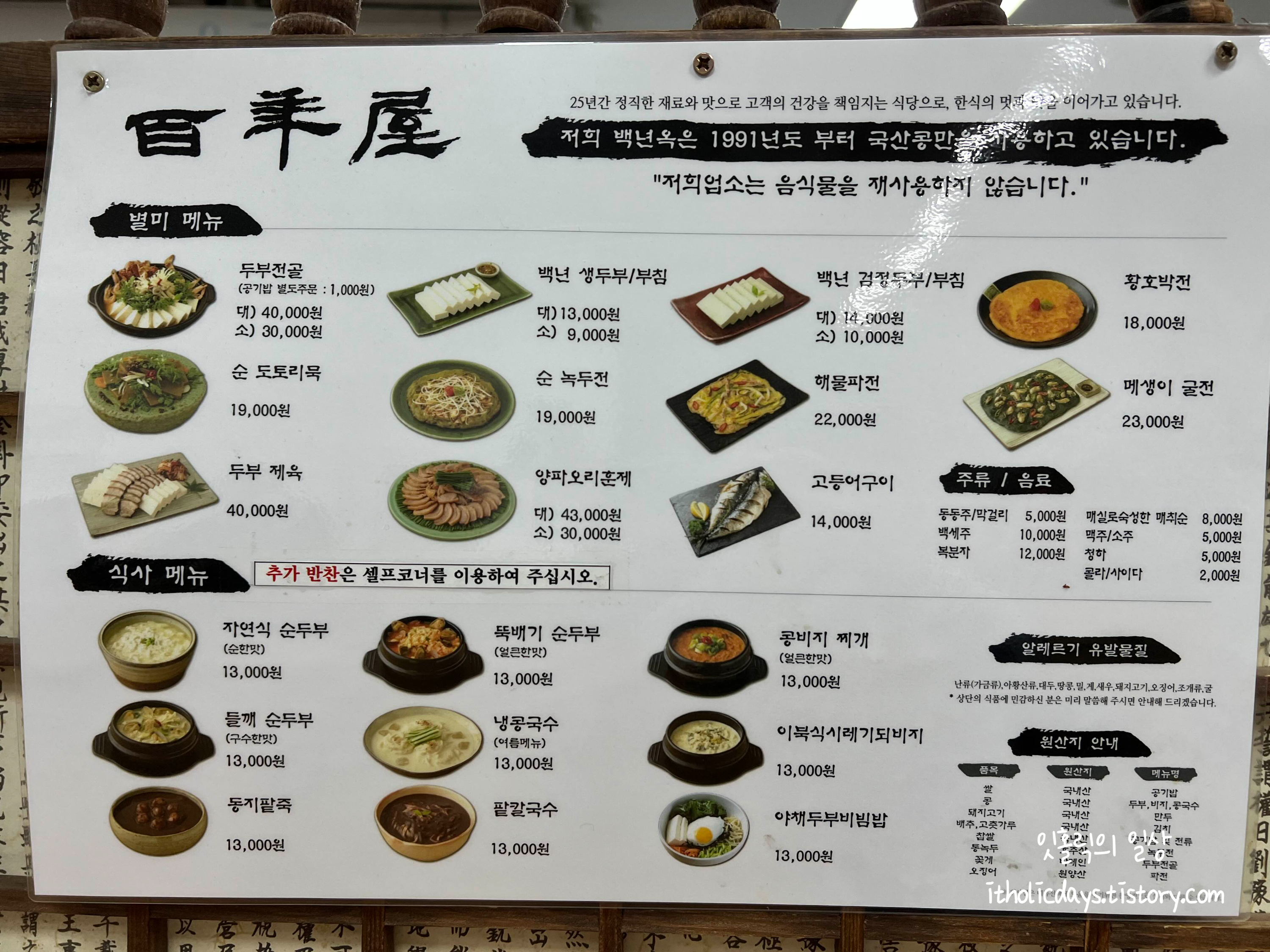 예술의 전당에서 공연을 보고 오랜만에 백년옥에 들렀습니다. 여기는 콩비지 찌개나 들깨 순두부를 주로 먹으러 들렀는데 오랜만에 왔는데도 아직도 인기가 많더라구요. 십수년전부터 예술의 전당에서 날씨가 쌀쌀하면 들리던 곳이었는데 여기가 이렇게 오래갈 줄 몰랐습니다. 물론 맛도 너무 감동이고 사장님도 친절하셔서 당연한 결과인 것 같아요. 십수년 전에는 예술의 전당 앞에 식당이 많이 없어서 배고프면 백년옥을 가거나 아예 교대나 서초쪽으로 가서 밥을 먹곤 했는데 그쪽을 포함해서 백년옥이 주변에서 제일 맛있었네요.