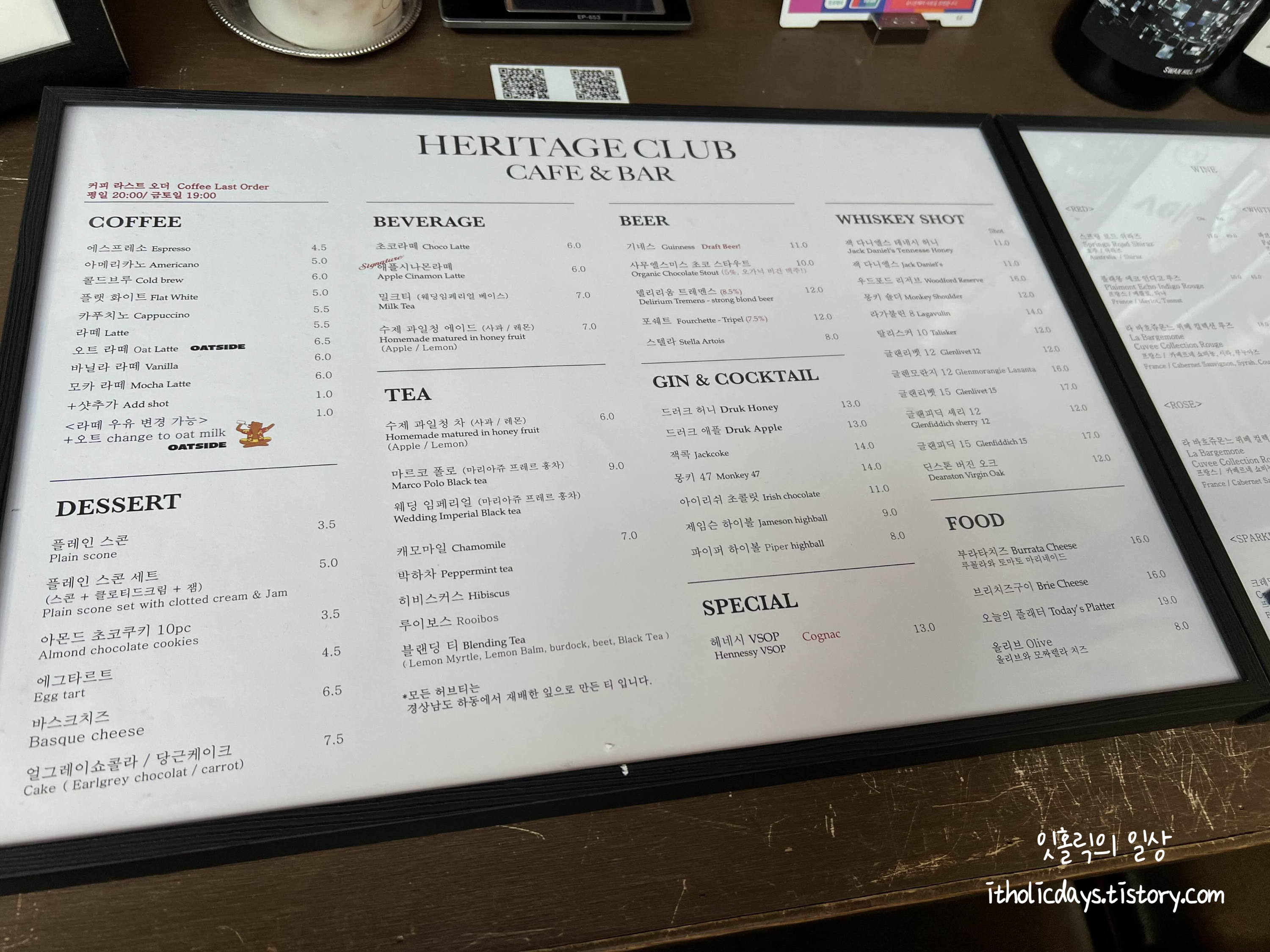 분명 제임슨 하이볼을 시켰는데 산토리 위스키잔에 나와서 마치 산토리 하이볼을 주문한 것 같은 착각에 잠시 빠졌네요. 하이볼이 진하지 않아서 편하게 마실 수 있는 농도예요. 기본으로 프리첼 과자를 줍니다. 일행이 시킨 드러큰 뭐시기 음료인데 맛이 좋고 뭔가 시그니쳐 느낌이 나기는 했지만 전혀 부럽지는 않았어요. 살짝 달달한 느낌이 단걸 별로 좋아하지 않는 저로서는 비선호였거든요. 오히려 깔끔한 하이볼이 역시 더위를 가시는데 나무랄데 없는 선택이었습니다. 헤리티지 클럽은 대낮에 오는 것도 좋은데 해가 떨어지고 어두울때 오면 분위기가 너무 좋을 것 같다는 생각을 했어요. 뭔가 옛스럽고 헤리티지한 느낌의 인테리어가 마음에 쏙 드는 곳이었습니다. 메뉴는 너무 많아서 방문할때의 느낌으로 시키면 좋을 것 같아요. 커피류는 안마셔서 잘 모르겠지만 맛보다는 인테리어와 분위기로 몇 시간씩 앉아서 이야기를 나눌 수 있는 곳인듯 합니다.