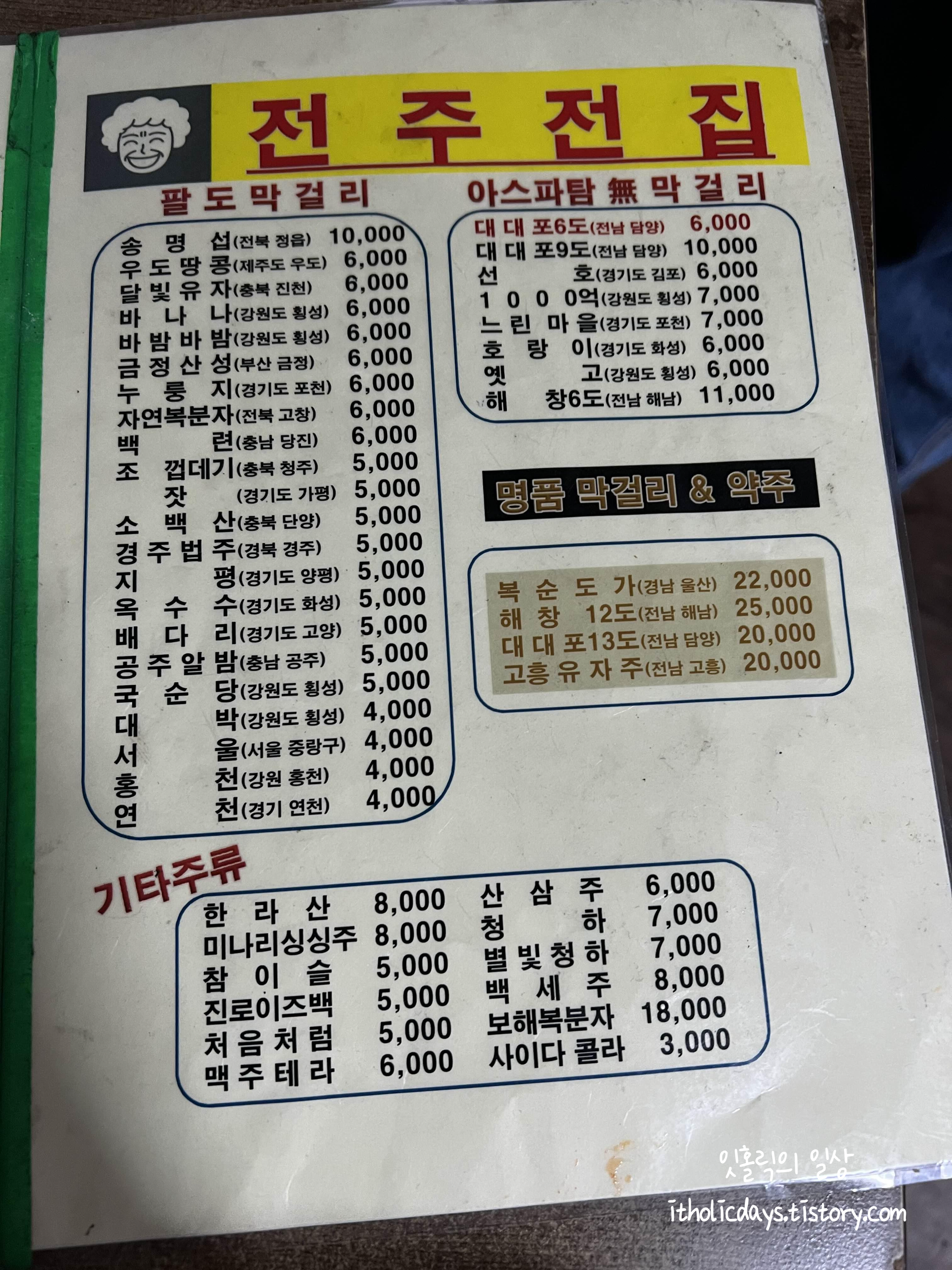 주문할 때 전주 전집의 안내 사항도 빼곡히 메뉴에 잘 적혀져 있습니다. 인상적인 팔도 막걸리 장르별 추천이 재밌더라구요. 다대포6도, 느린마을, 복순도가, 달빛유자가 달달하고 스위트한 로맨틱 코미디 장르의 막걸리이고 해창6/12도, 지평, 배다리, 소백산, 백련 막걸리가 담백하고 깔끔한 역사, 드라마틱한 장르, 그리고 금정산성, 옛고, 송명섭, 조 껍데기 막걸리가 시큼하고 미스터리한 판타지, 모험, 공포 장르라고 세 가지로 나눈게 인상적이었어요. 예전에 송명섭 막걸리를 전전 막걸리집에 갔을때 마셔봤었는데 확실히 송명섭 막걸리는 한입 마시고 유통기한을 바로 확인하게 만드는 시큼하고 뭔가 미묘-한 맛이 났습니다. 놀랍게도 유통기한이 안 지났으며 계속 마실수록 벌칙을 받는 것 같은 기분이 들었어요. 확실히 공포 장르에 가까운 듯한 맛이었습니다. 물론 송명섭 막걸리도 매니아층이 있다고 하더라구요. 그래도 저는 안전하게 이번에는 해창 막걸리 12도로 갔습니다. 이것도 꾸덕한걸 별로 안좋아하시는 분들은 싫어하시지만 가끔 이런데서 마실때는 특별한걸 주문해보고 싶어서 해창 막걸리로 주문했습니다.