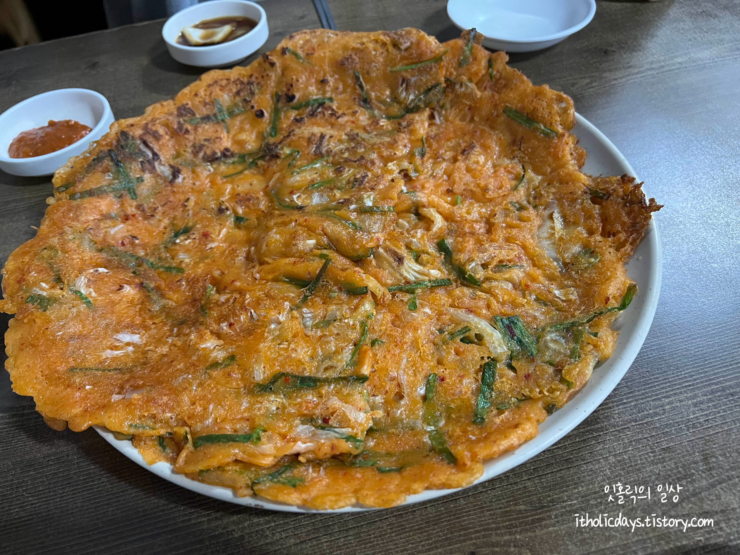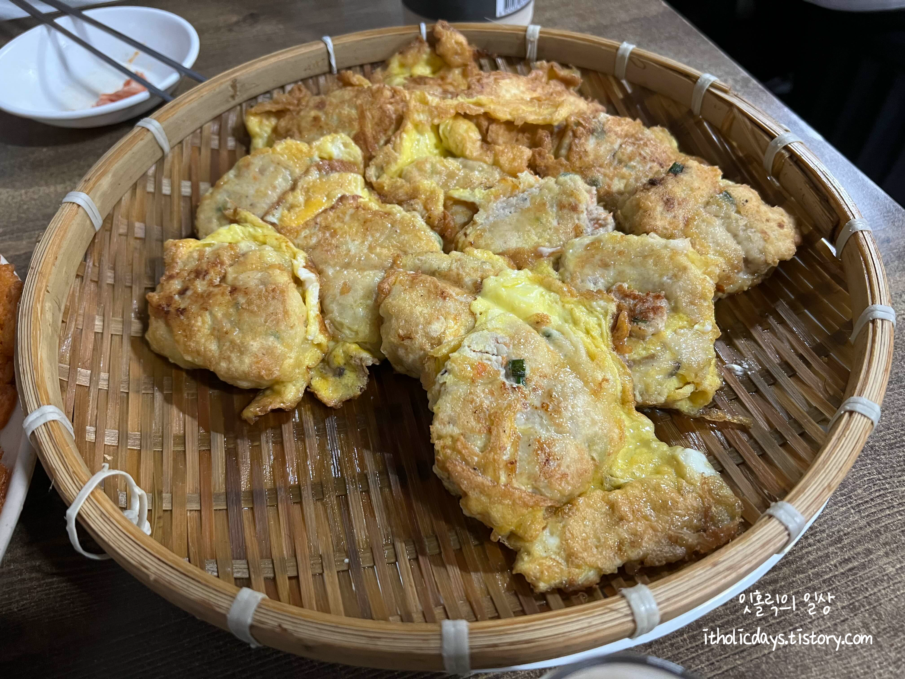 김치전이.. 상당히 많이 나와요. 화면으로 잘 안보일 것 같은데 김치전이 살짝 겹쳐져 있습니다. 물론 맛은 살짝 바삭하면서 감칠맛나는 그런 새콤하고 매콤한 맛이 나서 계속 손이 갑니다.