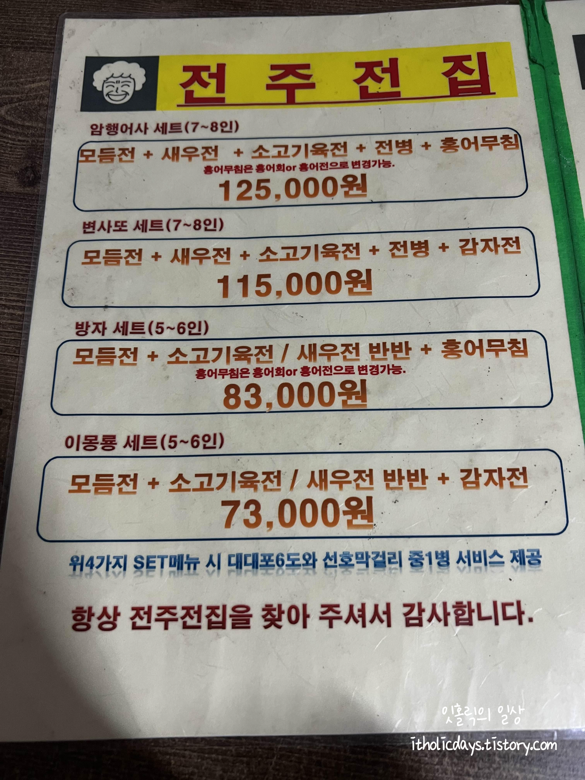 전주 전집은 메뉴별로도 주문할 수 있고 세트도 다양해서 세트로도 주문할 수 있습니다. 메뉴별로 소고기 육전(25,000원), 꿀돼지 삼겹전(25,000원), 동그랑땡(20,000원), 홍어무침(28,000원), 통통 새우전(25,000원), 김치전(19,000원), 깻잎전(20,000원), 고추전(20,000원) 등등 다양한 메뉴가 있습니다. 제 눈에 띄었던 메뉴는 꿀돼지 삼겹전과 동그랑땡, 그리고 통통 새우전에 김치찌개였네요. 그런데 같이 간 일행이 여기 동그랑땡이 굉장히 맛있다고 해서 묻지도 따지지도 않고 동그랑땡과 김치전을 주문했습니다.