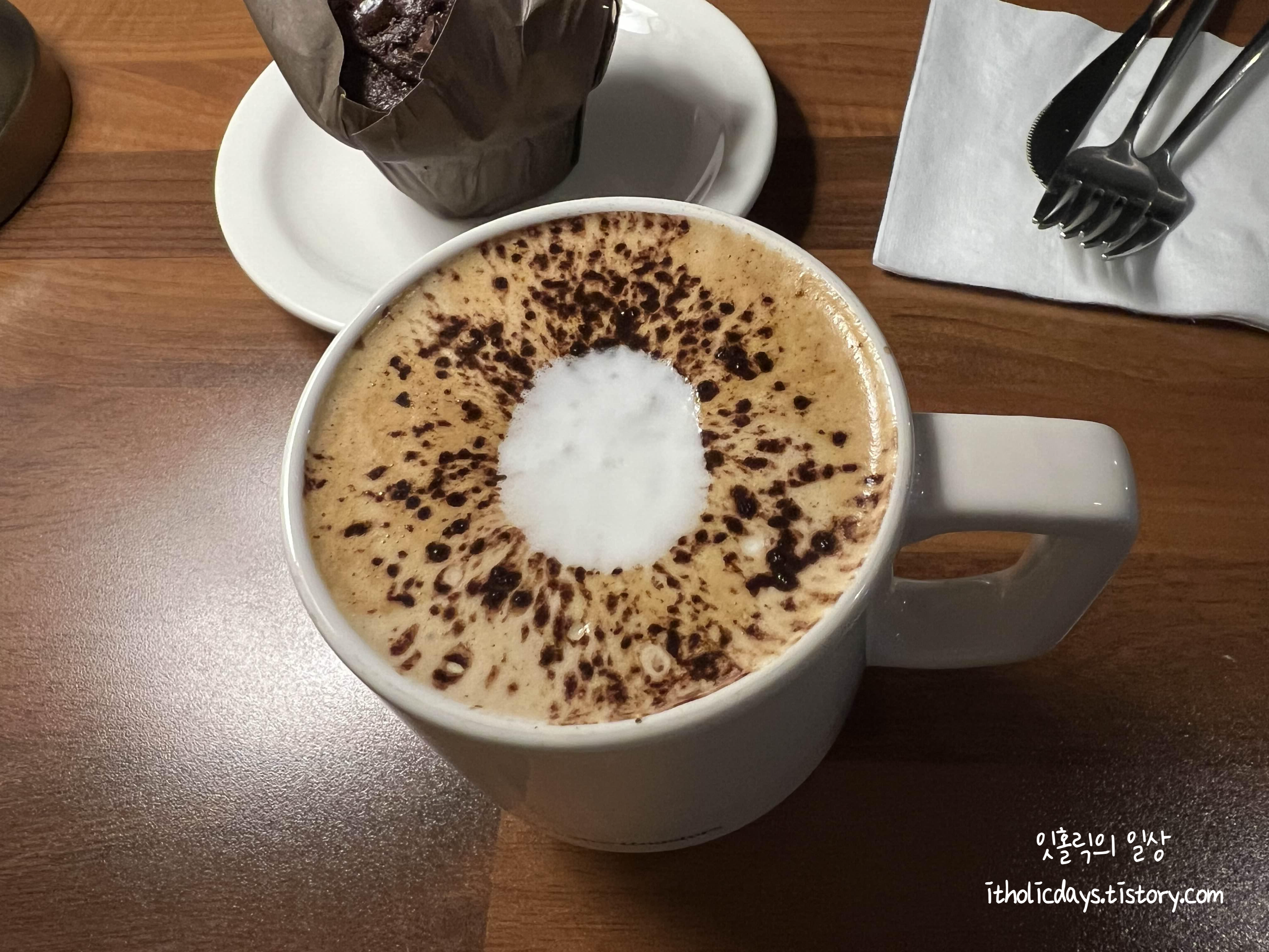 주문한 돌핀커피로스터스 크림커피 화이트입니다. 담백하고 달지 않아요. 크림커피 블랙은 어떨지 궁금해지네요. 쵸코 머핀을 같이 주문했는데 머핀을 살짝 뎁혀주셨는데 스르르 녹아서 너무 부드러웠습니다. 머핀인데도 촉촉하고 따끈한 브라우니 느낌으로 맛있었습니다.
