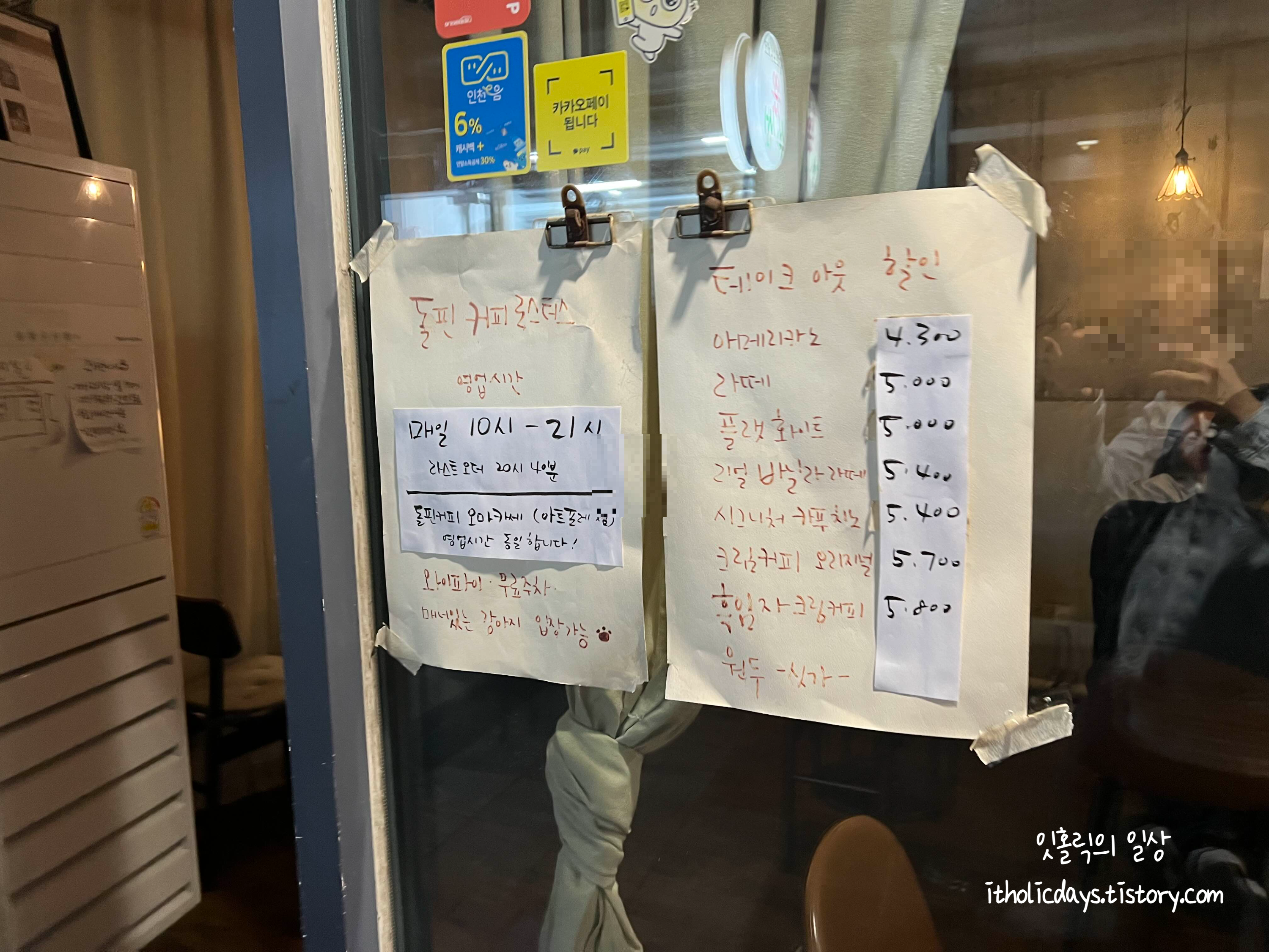 돌핀커피로스터스는 매일 10시부터 저녁 9시까지 영업한다고 하네요. 오랜만에 들렀더니 아트포레에 돌핀커피 오마카세도 새로 생겼는지 안내문구가 있더라구요. 다음에 아트포레 근처에 가면 한번 들러봐야겠습니다. 테이크아웃하면 할인도 해줍니다. 500원정도 싼 가격으로 마실 수 있어요. 카페에 매너있는 강아지는 입장할 수 있다고 하네요 :)