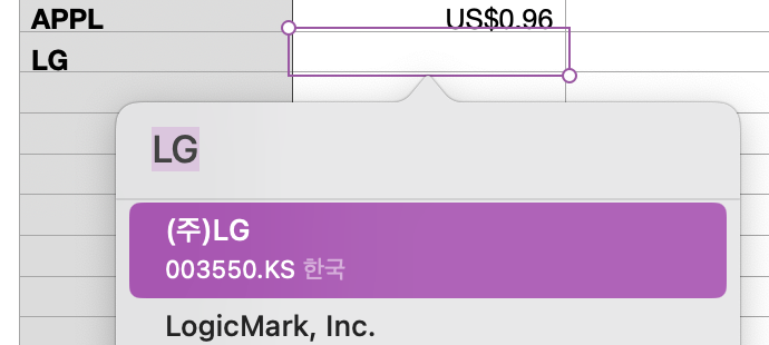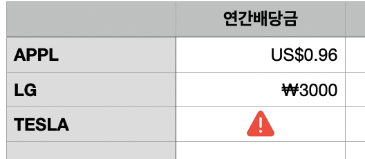 저는 연간배당금을 선택해서 입력해봤습니다. 요즘 핫한 에코프로비엠도 한글로 검색이 되구요, LG도 잘 검색됩니다. 테슬라 같이 배당을 하지 않는 기업은 저렇게 공사장 느낌표 아이콘이 뜨면서 오류를 뿜뿜하네요. Numbers에서 내부적으로 주식 관련된 기능을 제공해주니 편합니다. 분기별 배당금이나 배당일 캘린더 같은걸 만들때 유용하게 쓸 수 있을 것 같네요. 이밖에도 STOCK 함수로도 주식 관련 정보를 가져올 수 있는 기능을 제공하고 있어서 일괄로 뭔가 주식정보를 가져올때 좋을 것 같아요.