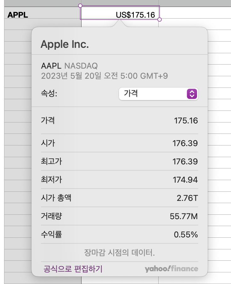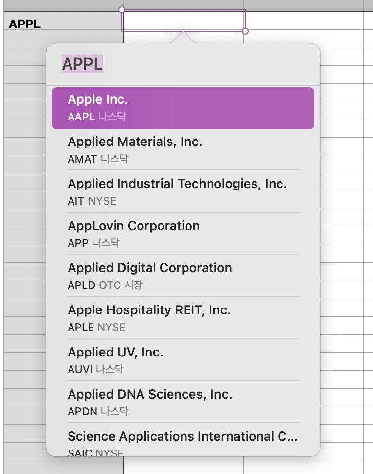 넘버스(Numbers)에서는 주식 정보를 쉽게 입력할 수 있는 방법을 제공하고 있습니다. 엑셀과는 다르게 인터넷과 연결만 되어 있다면 전 세계의 주식 시장에 등록되어 있는 웬만한 기업에 대한 특정 주식정보를 가져와서 입력할 수 있습니다.