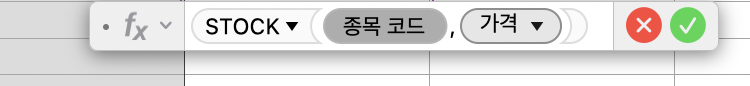 먼저, 입력하고자하는 기업의 이름을 컬럼에 쓰고, 입력을 원하는 셀을 선택한 뒤, 상단의 + 아이콘(삽입) 을 클릭하여 주식시세를 클릭합니다. 그러면 아래와 같이 주식명과 관련된 여러가지 검색 결과가 선택한 셀에 뿅하고 나타납니다.