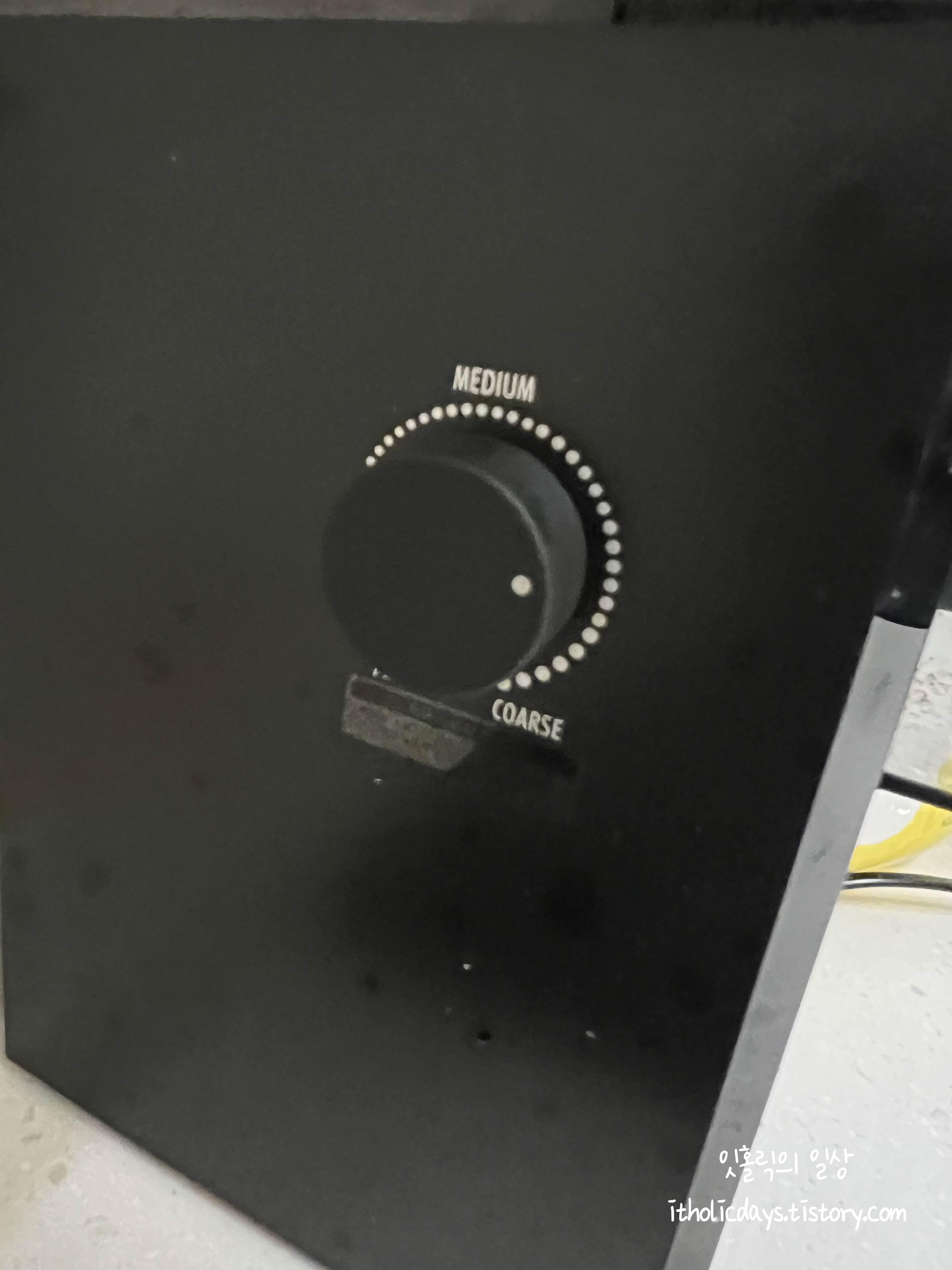 청소를 하고 원두를 채워넣고 갈아봅니다. 몇번의 시행착오 끝에 MEDIUM으로 하면 드립하기에는 너무 곱게 나오는 것 같아서 COARSE 와 MEDIUM 사이에 놓고 갈아봤어요.