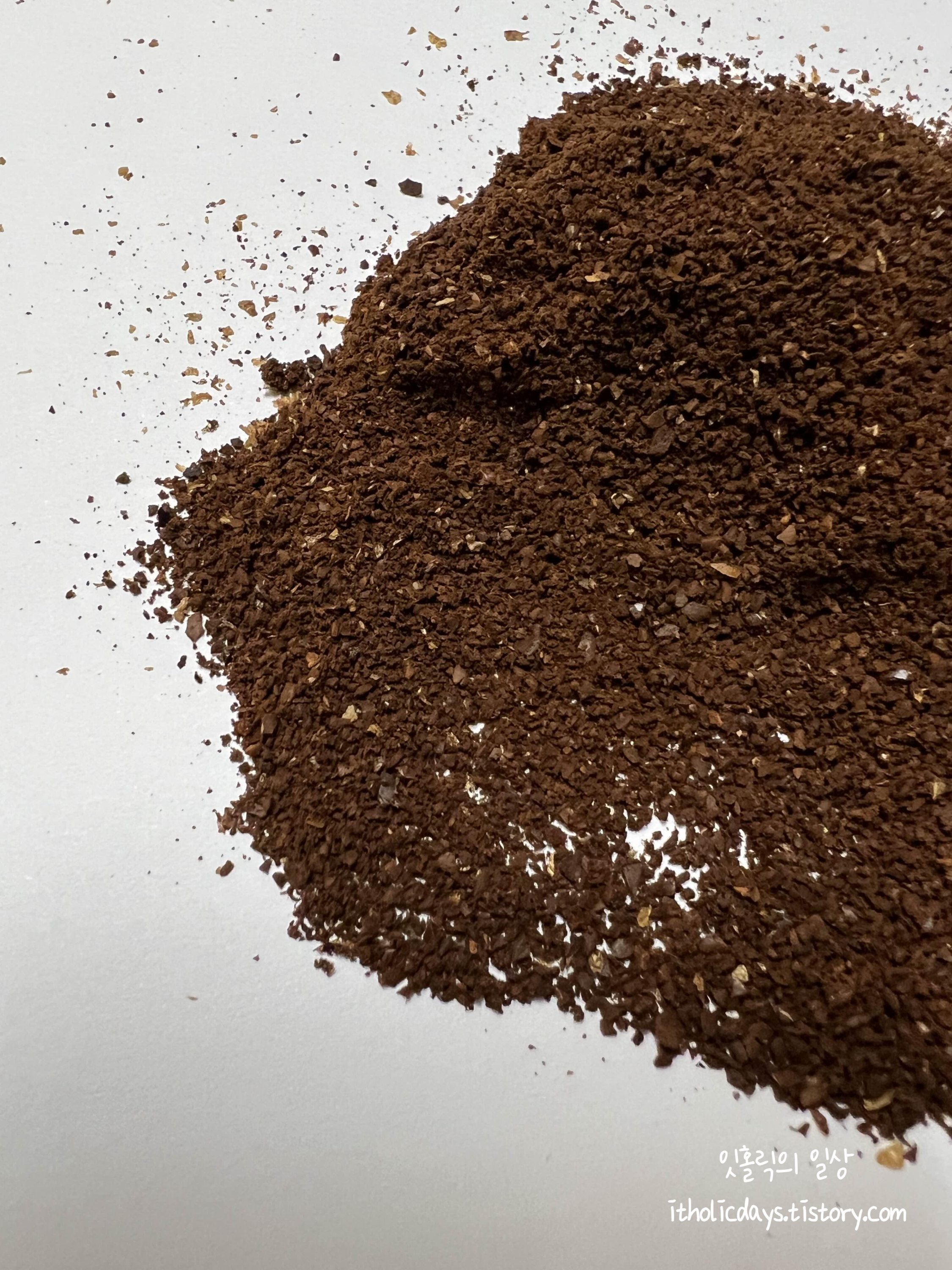 저 정도의 분쇄도로 원두를 갈면 이렇게 나옵니다. 핸드밀로 하는 것보다 균일하게 나오는 것 같아요. 제 수동 핸드밀이 좀 중국산으로 안 좋은 아이인 데다가 5년을 써서 그다지 좋은 상태는 아니지만요. 가루통에 정전기는 처음에만 강하게 나고 그 뒤로는 정전기는 없었어요. 가루는 좀 조심하지 않으면 주변이 눈 내린 것 처럼 가루천지가 되지만 조심하면 괜찮습니다. 조심히 꺼내서 조심히 원두 가루를 붇고 조심히 다시 넣으면 그다지 날리지 않아요. 이렇게 좋은 문명의 이기를 왜 진즉 안샀나 모르겠습니다. 너무 만족스러워요! ㅜㅜ