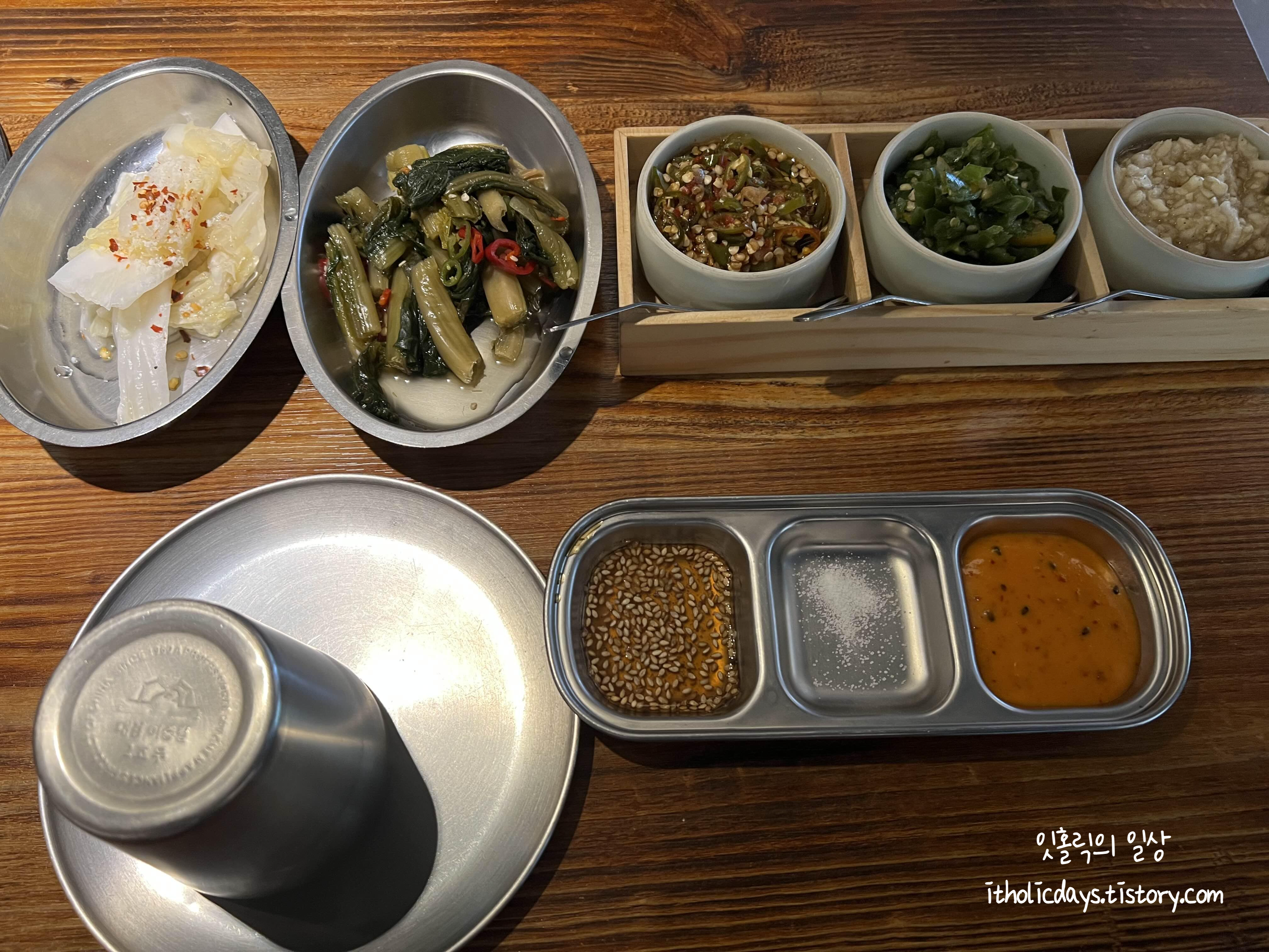 김치류는 두 가지에 다진마늘, 청양고추 같은 다양한 소스도 있어요.